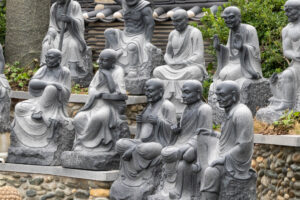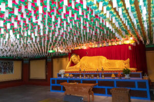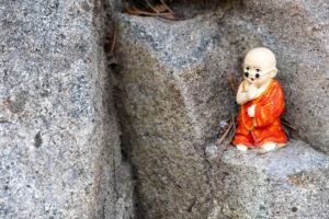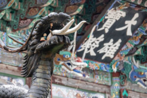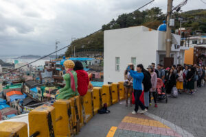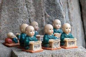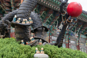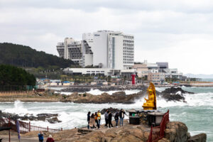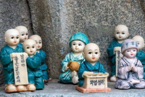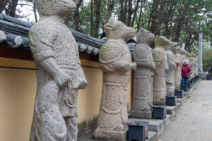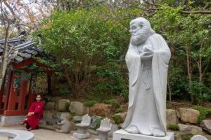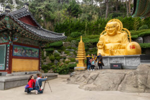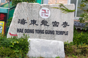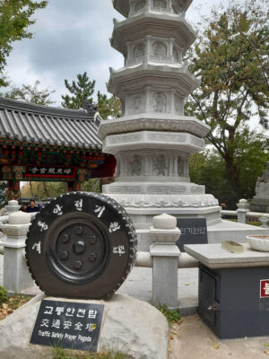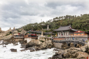 Heute morgen gehe ich den Tag genauso wie gestern an. Auf dem Weg zum Bus überlege ich mir als erstes Ziel zum Haedongyonggung Tempel zu fahren. Die Fahrt bis zum Tempel dauert fast 1,5 Stunden. Der Weg zum Tempel ist mit Souvenir- und Essensständen gespickt. Und vor dem Eingang steht noch eine „Pagode für den sicheren Strassenverkehr“. Was es nicht alles gibt. Zum Tempel geht es einige Stufen bergab und dann über eine Brücke. Der Tempel liegt direkt in an den Felsen am Meer. Das Wetter ist heute ziemlich bedeckt und ab und zu fallen ein paar Tropfen. Starker Wind peitscht das Meer gegen die Felsen unterhalb des Tempels. Ein goldener Buddha steht direkt am Meer und die Gischt spritzt hinter dem Buddha empor. Im Tempel beten ein paar Mönche bei buddhistischer Musik. Auch ein großer goldener und lachender Buddha steht neben einem der Tempel. Der Tempel ist wirklich schön, und wenn man ein wenig mehr in die Details schaut, dann findet man immer wieder kleine lustige Buddhafiguren in der Anlage verteilt.