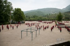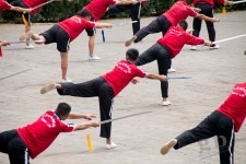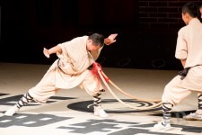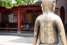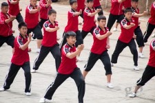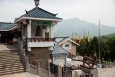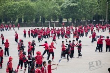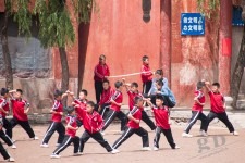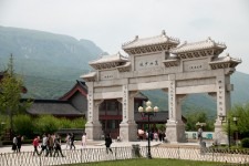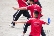 Der Eingang zum Shaolin-Kloster erinnert weniger an eine religiöse Stätte als an einen Freizeitpark. Überall neu errichtete Gebäude mit Souvenir-Shops und Restaurants. Direkt hinter dem Eingang ist eine riesige Trainingsfläche auf der hunderte von „Mönchen“ in Trainingsanzügen trainieren. Es gibt Schwertkämpfer, Boxer, Karate-Kämpfer und noch viel mehr. Weiter hinten müssen die Jungs mit Wasserschüsseln über den Platz rennen und dürfen dabei nichts verschütten.