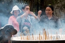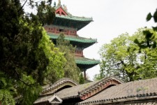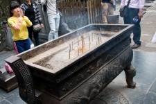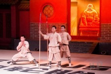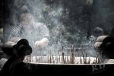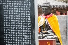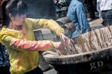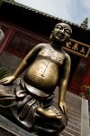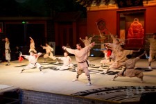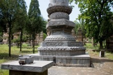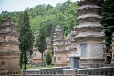 Kurz danach schauen wir uns eine Shaolin-Kampf-Show in einem neu erbauten „Tempel“ an. Die Vorführung ist wirklich exzellent! Und nach dem Ende der Show wird man wieder einmal durch Unmengen von Souvenir-Ständen geschleust. Aber dann erreichen wir auch den richtigen historischen Shaolin-Tempel. Das Bauwerk ist wunderschön gelegen und in mehrere hintereinanderliegende Höfe aufgeteilt. Viele Gläubige Buddhisten zünden Räucherstäbchen an und Beten vor den Buddha-Statuen. Und die Mönche verkaufen billige Schlüsselanhänger und Gebetsmühlen aus Plastik. Die nächste Attraktion im Shaolin-Freizeitpark ist ein Steelenwald aus kleinen Pagoden. Die kleinen Türmchen sehen toll aus in dem Sonnenlicht. Wir haben dann auch ausreichend viel gesehen und machen uns wieder auf den Rückweg.