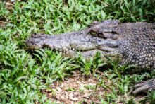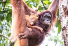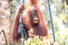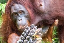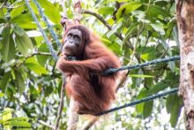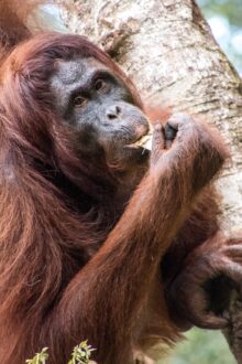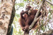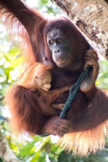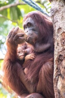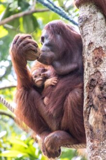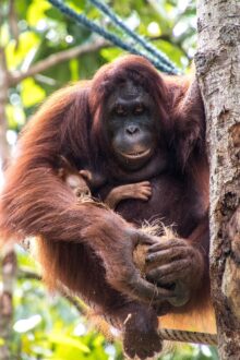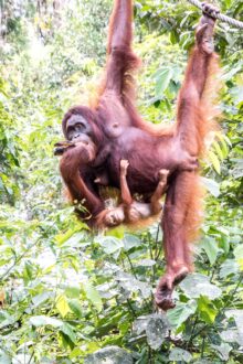 Die Tiere kommen bis auf wenige Meter an uns heran und holen sich Bananen und Kokosnüsse. Mit ihrer Beute klettern sie dann wieder die Bäume hinauf und die Bananenschalen fallen uns vor die Füße. Wie viel Kraft in diesen Tieren steckt, sieht man, als die Orang Utans die Kokosnüsse mit der Hand an einem Baum aufschlagen um an den leckeren Inhalt zu kommen. Und das kleine Baby schaut mit zerzausten Haaren unter den Armen der Mama hervor.