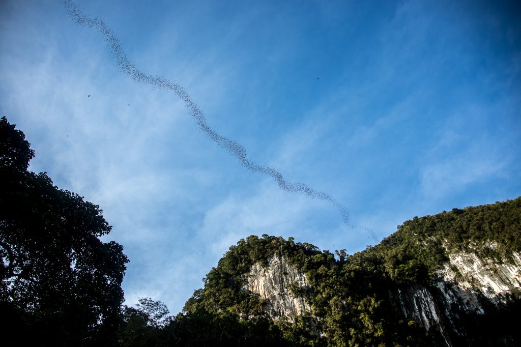 Auf der anderen Seite der Höhle ist ebenfalls ein Eingang bzw Ausgang der in den „Garden of Eden“ führt. Diese Höhle ist wirklich beeindruckend. Als wir wieder aus der Höhle heraus gefunden haben stehen wir wieder am gleichen Punkt wie am gestrigen Abend, von dem aus wir den Flug der Fledermäuse beobachten konnten. Und genau in diesem Moment starten die Fledermäuse wieder ihren Jagdausflug. Heute ist das Spektakel noch intensiver, denn das Wetter ist bei strahlendem Sonnenschein ideal und der Strom der fliegenden Fledermäuse reißt nicht ab. Kontinuierlich fliegen sie aus der Höhle und über uns hinweg. Dieses Ereignis lässt sich noch einmal richtig genießen. Für mich steht jetzt bereits fest, dass Mulu ein Highlight auf meiner Tour durch Malaysia ist.