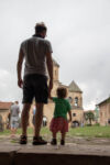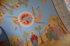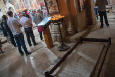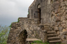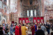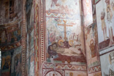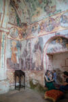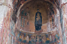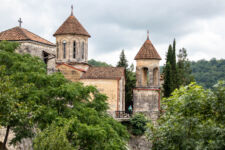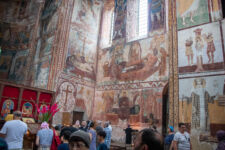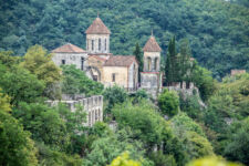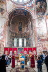 Die Klosterschule Gelati ist etwa 1000 Jahre alt und die Fresken an den Wänden sehen ebenso alt aus. Hatte ich mich gestern noch „beschwert“, dass die Kathedrale in Kutaissi so schlicht ist, so sind wir von dieser Kloster-Kirche ziemlich beeindruckt. Es findet auch gerade ein Gottesdienst statt, bei dem die Besucher nicht auf Bänken sitzen, sondern in dem hohen Raum mit Kerzen in der Hand stehen, oder vor einem der vielen Bilder beten. Dabei wird auch immer wieder gesungen. Die Wände sind komplett mit jahrhunderte oder vielleicht sogar tausend Jahre alten Bilder aus dem Leben Jesu bemalt. Durch die Fenster in der hohen Kuppel der Kirche fällt das Sonnenlicht durch die Schwaden des Weihrauch-Rauches auf die betende Gemeinde. WOW! Was für eine Atmosphäre. Man kann sich richtig vorstellen, wie hier im Mittelalter eine Andacht abgehalten wurde: Eigentlich müssten die Menschen nur noch alte Gewänder aus der Zeit anziehen, und die Zeitreise wäre perfekt.