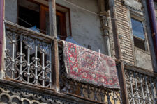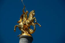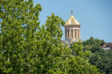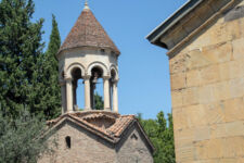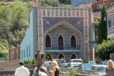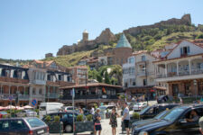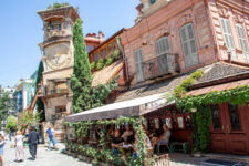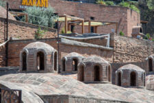 Weiter geht’s durch ein buntes Viertel mit Bars, Cafés und kunstvollen Ateliers zum Fluss. Tamar erklärt uns, wie das georgische Snickers hergestellt wird. Das sind Nüsse ummantelt mit einer Masse aus mit Mehl gekochtem Fruchtsaft. Das Zeug ist gar nicht so süß und ziemlich lange haltbar. Und es schmilzt nicht in der Hand. Vorbei an einigen Kirchen spazieren wir zu den Schwefel-Bädern, denn Tbilisi ist auch bekannt für seine Jahrhunderte alten Schwefelbäder. Nach der Sightseeing-Tour essen wir ein absolut leckeres Knoblauch-Hühnchen. WOW! Das war so lecker, da hat auch die kleine Ronja ihr Brot immer wieder in die Soße getunkt. Apropos Ronja: Die Kleine hat die komplette Stadtführung in ihrem Buggy verschlafen. Aber pünktlich zum Mittagessen ist sie wieder wach.