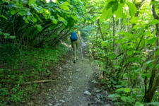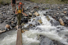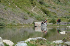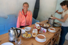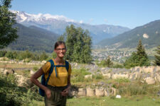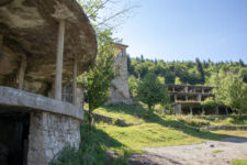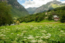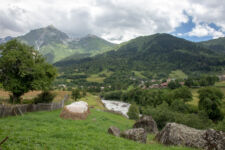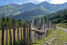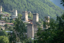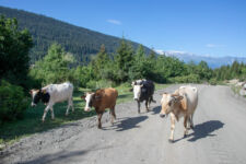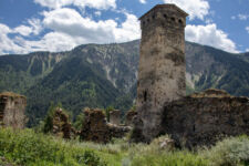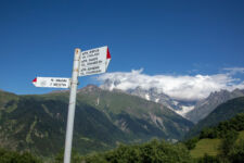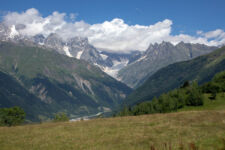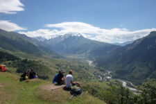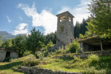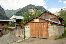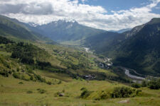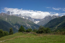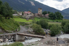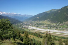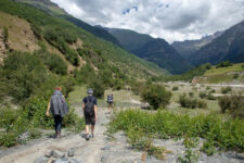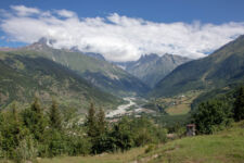Heute klingelt der Wecker um 7Uhr. Wir packen unsere kleinen Rucksäcke mit dem Nötigsten, denn wir starten heute mit unserer Wanderung für die nächsten Tage. Nach dem Frühstück geht es um kurz vor 9 los. Langsam steigen wir den Berg oberhalb von Mestia hinauf. Auf unserem Weg begleiten uns auch immer wieder Kühe und Schweine die am Wegesrand grasen oder in der Erde wühlen. Die Aussicht wird immer besser: der grüne Wald an den Hängen und die weißen Gipfel der Berge. Eine erste Pause machen Annemijn und ich an der Sowjet-Lodge. Diese Ruine war früher einmal das Hauptquartier für die sowjetischen Wintersportler. Und heute haust eine Kuh in den Ruinen. Der Trampelpfad führt uns auch weiter den Berg hinauf und bald sehen wir den Gletscher. Dann geht es einen steilen matschigen Pfad durch einen dichten Wald hindurch. Dieser Abschnitt des Weges kostet Annemijn einiges an Überwindung. Sie hat Höhenangst. Aber nicht weit entfernt ist der höchste Punkt unserer heutigen Wanderung erreicht. Wir sind auf etwa 2600 Metern und haben einen tollen Blick auf das Tal auf der anderen Seite des Berges. Unser Ziel liegt also irgendwo dort hinten. Den Blick genießen auch noch weitere Wanderer und so kommt man schnell ins Gespräch. Wir gehen mit weiteren deutschen Wanderern weiter: Elisa und Patrick aus Hamburg. Bergab geht es an verlassenen Dörfern und vielen Wiesen vorbei. Immer wieder ragen die hohen Wehrtürme aus den Dörfern hervor. Auf unserem Weg treffen wir auch eine große Gruppe von Jugendlichen einer Kirchenorganisation. Diese Gruppe läuft allerdings nur diesen einen Tagesabschnitt und fährt abends noch mit dem Bus weiter. Der letzte Abschnitt unseres heutigen Tages führt an einem reißenden Fluss entlang. Der Fluss führt Gletscherwasser und ist ziemlich kalt. Wir überqueren einen Gletscherbach über ein wackeliges Brett, bevor es dann über eine Eisenbrücke über den reißenden Fluss in das Dorf Zhabeshi geht.