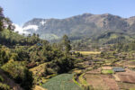 Die Fahrt geht immer weiter die Berge hinauf. Es gibt immer wieder wunderschöne Teefelder in den Hügeln zu sehen, aber auch ab und zu einige Gemüsefelder mit Vogelscheuchen. Mein Fahrer macht den letzten Stop auf der Route am Punkt „Top Station“. Hier gibt es auch leckeren Masala-Tee. Als ich zwischendurch auf meinem Handy die Karte checke, wird mir angezeigt, dass die „Top-Station“ erst in einem Kilometer Entfernung liegt. „Aber dort ist es genauso bewölkt wie hier. Das lohnt sich nicht“ sagt mir mein Fahrer und auch der Teeverkäufer. Ja, wir sind ziemlich weit oben in den Wolken und die Sicht ist nicht sehr weit, aber wenn ich schon einmal hier bin, dann möchte ich auch alles sehen. Mein Fahrer will aber nicht so richtig. Erst als ich energischer werde, fährt er mich noch ein Stückchen weiter. Die letzten 500m gehe ich zu Fuß vorbei an kleinen einfachen Restaurants und Tee-Ständen. Dann stehe ich an einem Tor, an dem Eintritt genommen wird. Gerade kommt ein englisches Päärchen aus dem Eingang heraus. „Ja es lohnt sich, auch wenn es etwas bewölkt ist“. Ja dann…. Also zahle ich die 50 Rupees Eintritt und mache mich auf die letzten Meter. Es geht erst einmal auf staubigen Treppenstufen bergab zu einem Aussichtspunkt, von dem man das ganze Tal überblicken kann. Es ziehen zwar immer wieder dicke Wolken vorbei, aber die Aussicht ist trotzdem schön. Bei wolkenlosem Himmel muss es hier eine fantastische Aussicht geben. So, jetzt kann es auch wieder zurück in die Stadt gehen. Nach einer kurzen Mittagspause mit Tee und Kuchen gehe ich den etwa 2km langen Weg zum Tee-Museum zu Fuß. Ich mag es solche kurzen Strecken immer wieder zu Fuß zu gehen, da man so immer wieder kleine Dinge entdeckt wie z.B. Kleine Tempel oder Häuser an denen man sonst einfach vorbeirauschen würde.