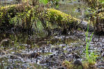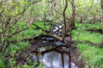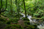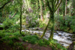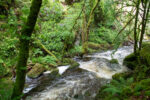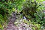 Auf dem gleichen Weg geht es bis in den Wald wieder bergab. Dort biege ich einen Weg zu früh links ab. Dafür werde ich dann später aber mit einem steilen und steinigen Weg durch den Rhododendronwald belohnt. Und einer regnerischen Aussicht auf den Muckross Lake und das Muckross House. Auch eine Quelle gibt es auf dem Weg. Und zur Strafe, weil ich den falschen Weg genommen habe, geht es am Ende des Höhenwanderwegs über nasse und rutschige und noch dazu extrem steile Felsstufen etwa 300m Höhenmeter bergab. Einige blaue Flecken und Prellungen später später erreiche ich unten die Landstraße. Es regnet seit einiger Zeit wieder. Der Regen peitscht mir ins Gesicht während ich gleichzeitig von der Sonne geblendet werde. Was für ein Wetter!