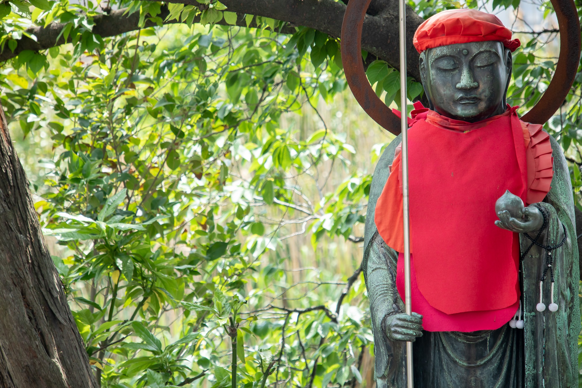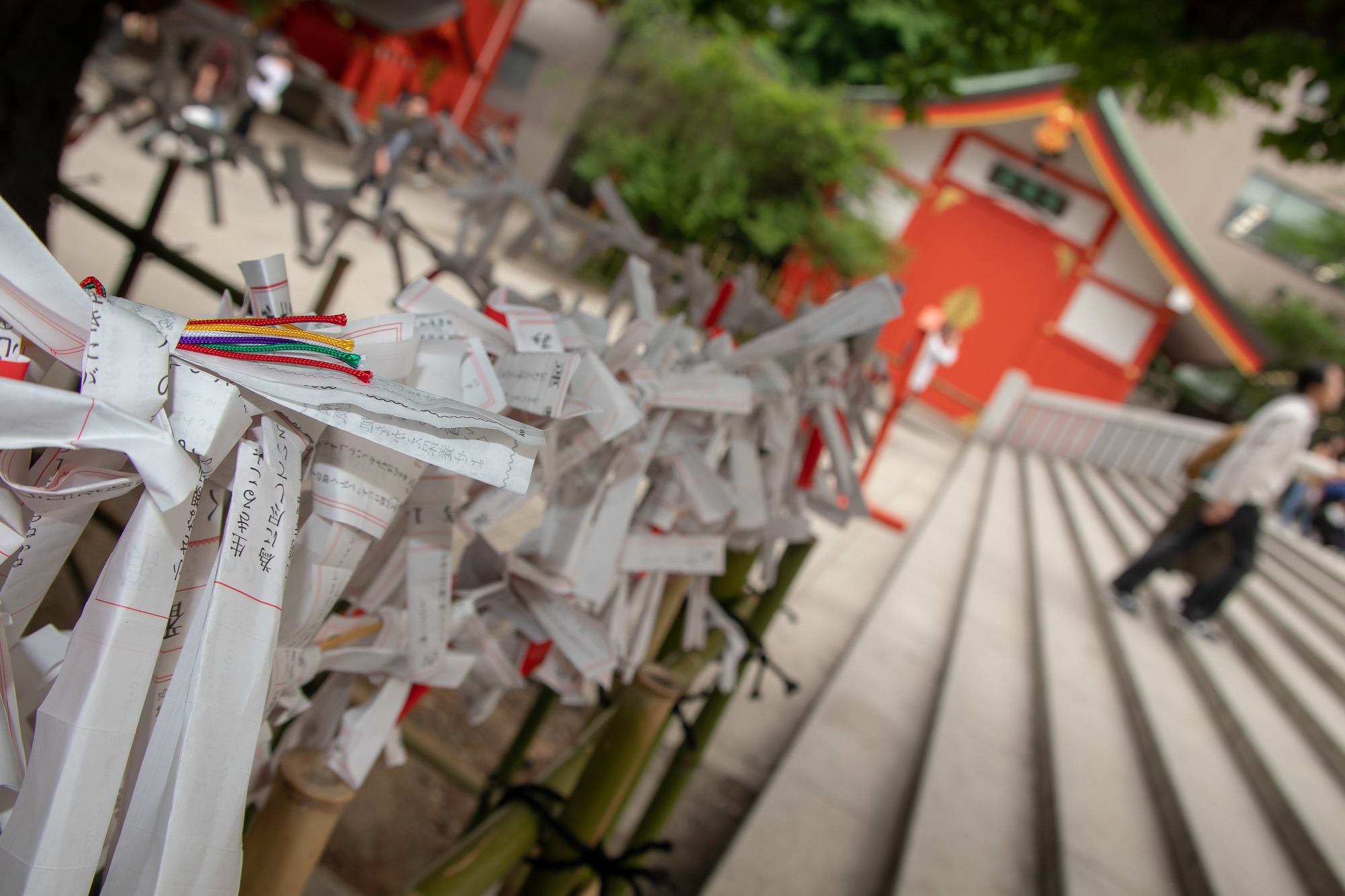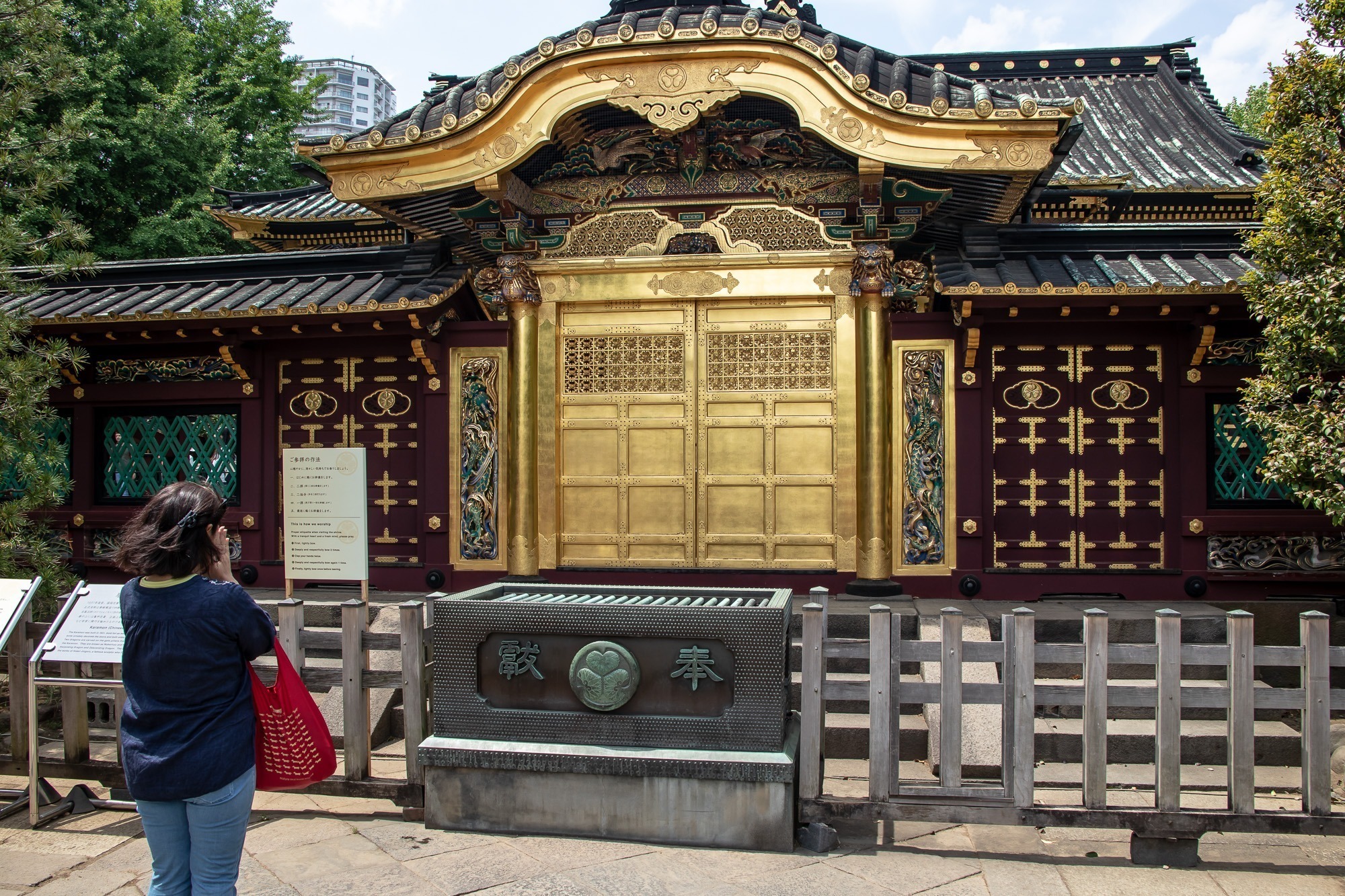 In der Ferne sehe ich den Park Shinjuku-Goren. Das ist doch bestimmt ein tolles Ziel um ein bisschen unter Bäumen zu chillen. Also mach ich mich auf den Weg. Kurz vor dem Eingang zum Park kommen mir eine Menge Menschen entgegen. Und dann steh ich vor dem Tor: Closed. Geschlossen. Na Super. Mit den Parks in Tokio hab ich irgendwie kein Glück. Aber wer lesen kann ist klar im Vorteil: auch im Reiseführer steht, dass der Park um 16.30Uhr schließt. Na das sollte man mal in Berlin versuchen: kein Feierabend-Bier im Park? Das würde bestimmt zur nächsten Volksabstimmung oder der Abwahl des Senats führen. Ok, also kein Park mehr für heute. Aber in der Nähe ist noch ein Schrein. Dort kann ich bestimmt auch noch ein bisschen chillen. Es gibt in Japan Tempel und es gibt in Japan Schreine. Tempel sind in der Regel buddhistisch. Schreine hingegen betritt man durch ein japanisches Tor und in einem Schrein werden japanische bzw Shinto Götter angebetet. Und es gibt tausende von Göttern. Für alles gibt es einen Gott: Wasser, Erde, Holz, Reis, Barmherzigkeit, Glück,….