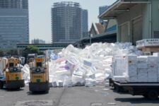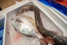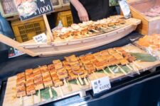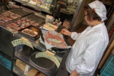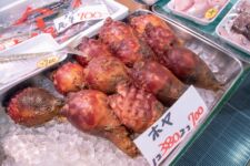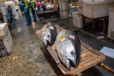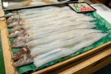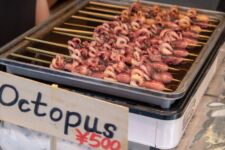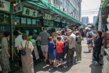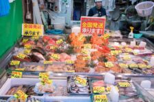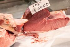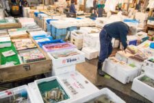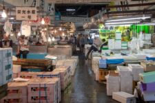 Heute morgen mache ich mich gleich nach dem Frühstück auf zum Fischmarkt „Tsukiji“. Dort kann man auch eine Thunfisch-Auktion beobachten, aber dazu muss man bereits spätestens um 3Uhr beim Fischmarkt sein, um einen der 120 zugelassenen Gästeplätze zu bekommen. Und dann startet die Auktion auch erst gegen 6 Uhr. Da geh ich doch lieber am Vormittag, denn in den „Inner Market“ gelangt man als Tourist auch erst um 10 Uhr. Im „Outer-Market“ gibt es jede Menge Sushi-Läden, Obsthändler und eigentlich alles was irgendwie mit Essen zu tun hat. Auch Messer, Algen und Rindfleisch. Aber an den meisten Ständen gibt es Fisch: kleine, große, rote, braune, lange und kurze, Muscheln, Aal, einfach Alles. Am beeindruckendsten finde ich den Thunfisch. So ein Thunfisch ist riesig und auch ziemlich teuer. Einige komplette Thunfische werden für viele tausend Euro verkauft. Da wundert es nicht, dass so ein Thunfisch nirgends unbeobachtet herumliegt. In der Nähe ist immer ein Aufpasser der Security. Auf dem „Inner-Market“ flitzen jede Menge kleine Elektro-Karren herum und bringen Kisten von einem Stand zum Anderen.