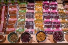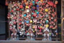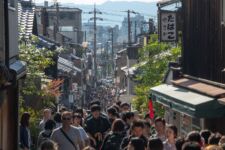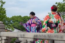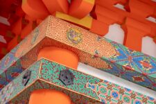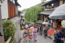 Als es leicht anfängt zu regnen mache ich mich auf den Weg zur nächsten Tempelanlage. Google Maps sagt: 30min. Etwa zweieinhalb Stunden später bin ich dann auch dort. Es waren einfach zu viele Menschen in den Gassen. Der Weg führt durch schmale Gassen mit alten Häusern. Natürlich wird hier eine Menge Souvenirs, Essen und Getränke verkauft. Und die Wege sind voller Menschen. Man schiebt sich einfach mit der Masse weiter. Aber ab und zu schau ich auch mal in einem Shop vorbei. Besonders lecker war es, als ich jede Menge eingelegtes Gemüse probieren durfte: süss, sauer, scharf, und unzählige Kombinationen mit Rettich, Gurke und ehrlich gesagt hab ich keine Ahnung wie das ganze andere Zeug hieß, dass ich probieren durfte. Ich kaufe mir dort auch eine eingelegte Gemüsegurke am Stiel. Statt Eis am Stiel. Dieses Viertel ist zwar voller Touristen aber trotzdem sehr interessant. Immer wieder führen kleine Gassen zu kleinen Tempeln oder Schreinen oder zu kleinen wunderschönen Gärten. Ein Tempel ist zum Beispiel in viele faustgroße Wollknäuel gehüllt. Das passt wunderbar zu den bunten Kimonos der Japanerinnen. In Kyoto kann man übrigens auch Kimonos ausleihen. Das ist auch der Grund, warum so viele als Geisha verkleidet durch die Stadt laufen und ständig Selfies machen. Ziemlich Lustig sieht es aus, wenn Europäer in diesem traditionellen japanischen Outfit herumlaufen. So wie es in Hamburg bescheuert ausschaut, wenn Japaner in Lederhose und Dirndl herumlaufen. Jeder will halt seinen Spaß 🙂