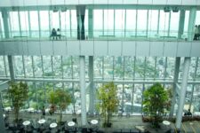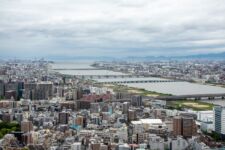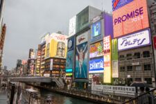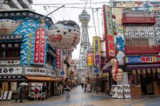 Heute Vormittag will ich mal nach ganz oben. Und das gleich zwei mal. Als erstes fahre ich mit der Bahn zum „Umeda Sky Building“. In einem kleinen Park neben dem Wolkenkratzer genieße ich noch ein Frühstück aus dem Supermarkt. Und über mir ragt dieses verrückte Hochhaus in den Himmel. Das Gebäude besteht aus zwei Türmen, die oben mit einer Dachterrasse miteinander verbunden sind. Auf die Dachterrasse gelangt man über eine Rolltreppe, die vom 35. Stockwerk des einen Turms in die 40. Etage des anderen Turms führt. Sozusagen eine Himmelsrolltreppe. Abgefahren! Oben gibt es dann eine wundervolle Rundumsicht auf Osaka: Auf der einen Seite die riesigen Wolkenkratzer, ein breiter Fluss fließt in Richtung Hafen, hier sind in der Ferne Container-Schiffe und auch ein Kreuzfahrtschiff zu entdecken. Auf der anderen Seite sehe ich wie ein Flugzeug nach dem anderen auf dem International Airport landet. Die Japaner sind schon ziemlich abgefahren. Im Turmrestaurant genieße ich erst einmal einen heißen Kaffee, auch wenn es hier einige deutsche Biersorten gibt: Köstritzer, Becks, Jever, Warsteiner und Krombacher.