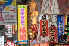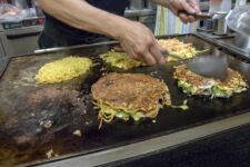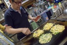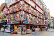 Es wird Zeit für ein Mittagessen. Mein Trip Advisor schlägt mir ein kleines Okonomiyake-Restaurant vor. Das Restaurant ist wirklich klein und der Okonomiyake wird direkt vor mir auf der heißen Platte zubereitet. Ein Okonomiyake ist eine Art  Pfannkuchen mit jeder Menge Gemüse, Fleisch und Fisch. Eigentlich eher eine Pizza. Oder eine Mischung aus Pfannkuchen und Pizza. Und sehr lecker! In der Nähe ist auch das Vergnügungsvierter Shinsekai. Hier geht es zu wie auf dem Rummel. Abends muss es hier sicherlich brechend voll sein. Aber da ich nur noch den heutigen Tag in Osaka habe und es außerdem immer mal wieder etwas regnet spaziere ich vom Vergnügungsviertel in das Manga-Viertel. Im Viertel Namba geht es um Comics: hier gibt es riesige Comicbuchhandlungen, und wer denkt in einer Buchhandlung ist es still wie in einer Bücherei, der irrt: Es ist total laut, denn überall sind kleine und große Bildschirme, auf denen irgendwelche Mangafilme laufen. Und der Sound ist total aufgedreht. Die Verkäufer sind passend im Manga-Style gekleidet. Krass! Ich entdecke auch eine kleine Spielhölle in der die Spielkonsolen aus meiner Jugend zum Zocken stehen: Super Mario, Ninja Fighter und andere. Auch die Konsolen sind auf volle Lautstärke gedreht! Es gibt sogar ein Massage-Studio, indem man sich von Frauen im Manga-Comic-Outfit durchkneten lassen kann. Die Japaner haben wirklich eine Macke! Bei einem heftigen Regenschauer mache ich noch einen kleinen Abstecher in ein riesiges Pachinko-Slot-Haus. Pachinko ist ähnlich wie Flipper. Nur mit wesentlich mehr Kugeln die hier durch die Maschine fliegen. Hier ist es so laut, dass man sein eigenes Wort nicht mehr verstehen kann. Ich versuche die Szenerie zu filmen, aber die Sicherheitskräfte hier sind immer ziemlich flott zur Stelle: Filmen und Fotos verboten. Schade.