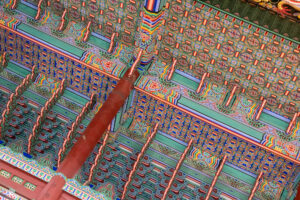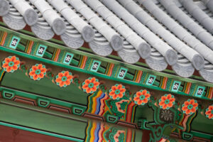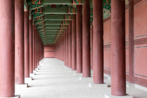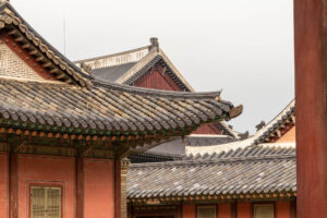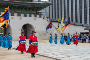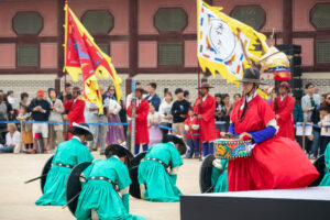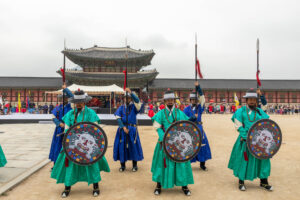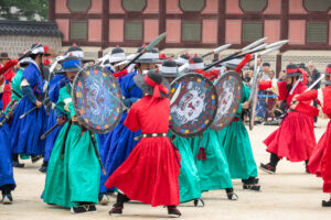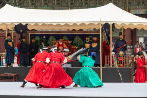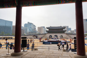 Die Gebäude des Palastes sind aus Holz gebaut und mit den typischen koreanischen Farben bemalt: rot, blau, gelb, grün und braun sind die vorherrschenden Farben. Die Dachziegel sind große, runde, schwarze Dachpfannen. Der Kontrast dieser alten Gebäude zu den modernen Hochhäusern in der Umgebung ist schon gewaltig. Im ersten großen Hof des Palastes, für den man noch nicht mal Eintritt bezahlen muss, wird zum 11 Uhr eine Zeremonie vorgeführt, bei der historische Krieger gegeneinander mit Schwertern, Lanzen und Pfeil und Bogen gegeneinander kämpfen. Die kleine Schlacht ist ziemlich beeindruckend und wird von Trommeln unterstützt.