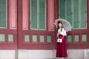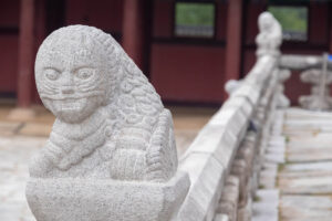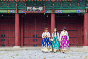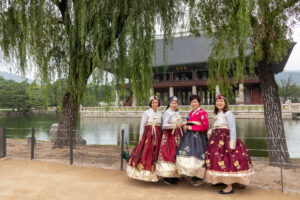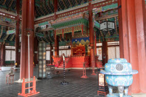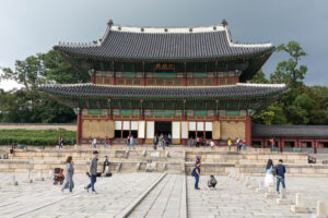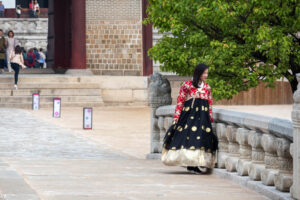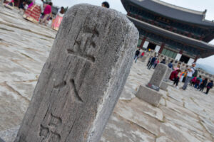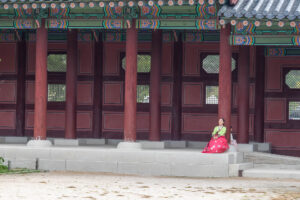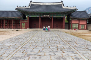 Die Palastanlage ist mitten in der Stadt und ziemlich riesig. Es reiht sich ein riesiger Palasthof an den nächsten. Die Höfe sind von Mauern umgeben und meist steht in der Mitte ein großer Pavillon oder ein königliches Gebäude. Man kann sich übrigens auch das Eintrittsgeld sparen, wenn man in einem historischen Kostüm den Papst besucht. Aus diesem Grund kann man sich überall Kostüme ausleihen. Und in den Palastanlagen schlendern eine Menge kostümierte herum. Das sieht bei den Koreanern ziemlich cool aus, aber bei europäischen Touristen eher ziemlich lustig.