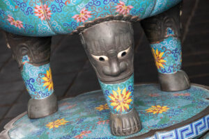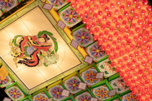 Nach einer kleinen Kaffeepause gehe ich zu einem buddhistischen Tempel in der Nähe. Drei große goldene Buddhas stehen in diesem Tempel. Die Decke des Tempels ist mit hunderten oder tausenden Lampions bedeckt. Der Vorplatz sieht aus wie eine Gartenausstellung an. Hier stehen goldene Drachen und goldene Buddhas die zur Hälfte mit Chrysanthemen bedeckt sind. Die Pflanzen legen sich wie eine grüne Decke über die goldenen Figuren.