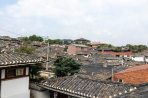 Gleich um die Ecke liegt ein Viertel mit alten Häusern. Diese kleinen Häuschen mit ihren typischen koreanischen Rundziegeln ist eigentlich eine Wohngegend. Deshalb laufen hier zwischen den Touristen einige Einwohner mit Schildern herum, auf denen beschrieben steht, dass man sich bitte leise sein soll. Und hier bewegen sich einige tausend Menschen die steilen Gassen herauf und herunter.
