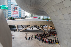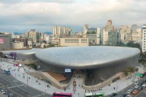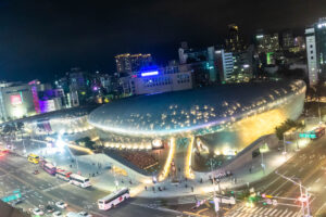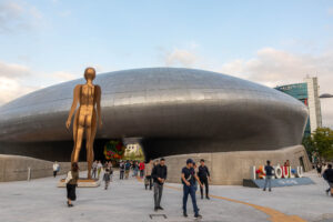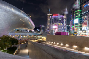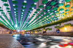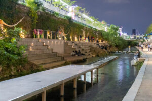 Mir U Bahn fahre ich dann zum Dongdaeum Design Center. Dieses Kunst und Kulturzentrum ist wie ein Raumschiff zwischen die Hochhäuser gebaut. Und bei Nacht sieht es aus als lande das Raumschiff gerade. In der Nähe gibt es auch noch einen kleinen Fluss der ein Stück durch die Stadt fließt. Die Stadt hatte diesen Fluss vor einigen Jahren von Müll befreit und renaturiert und an einigen Abschnitten mit ein paar Lichtanlagen ausgestattet. Hier kann man Kilometerlang spazieren gehen und hört eher die Grillen zirpen, als die wenige Meter entfernen Autos der Großstadt.
