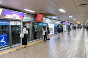 Gehen 8 Uhr wache ich auf als mein Zimmergenosse in seinem Koffer kramt. Guten Morgen Seoul! Ich besorge mir in dem 7eleven-Supermarkt um die Ecke erst einmal einen Kaffee zum Frühstück. Zu mehr habe ich um diese Uhrzeit noch keinen Hunger. In Deutschland ist es jetzt 1 Uhr morgens. Dann geht’s zum nächsten Bahnhof. Die U Bahn Stationen liegen hier in Seoul wirklich ziemlich tief in den Untergrund vergraben. Gut das es Rolltreppen gibt. Mithilfe der Smartphone App von naver.com navigiere ich ziemlich problemlos durch die Stadt und das Bahnnetz. Google-Maps funktioniert in Südkorea nicht. Der Staat unterbindet das Speichern von detaillierten Karten auf Servern außerhalb des Landes. In Nordkorea würde Google-Maps allerdings wieder funktionieren.