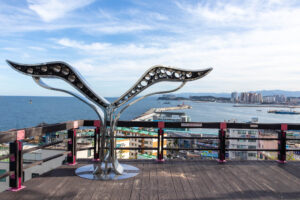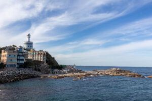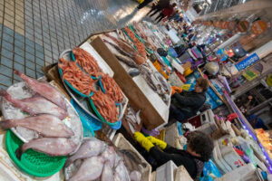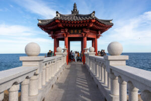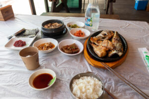 Sobald der Bus heraus ist aus der Metropole Seoul ist um uns herum nur grüner Wald und Berge. In den kleinen Tälern dazwischen liegen kleine Ackerflächen und noch kleinere Dörfer. Nach 2,5 Stunden komme ich in Sokchu an. Ich bin mit dem Bus von der Westküste an die Ostküste gefahren. Mein Hostel liegt nur 5min vom Busbahnhof entfernt. Nach dem Checkin gönne ich mir am Meer, das nur eine Seitenstrasse entfernt liegt, ein Mittagessen mit gebratenem Fisch, verschiedenen Sorten Kimchi, Reis und einer Suppe mit Hummer und Tofu. Das ist alles sehr lecker! Dann geht los auf eine kleine Sightseeing Tour. In der Nähe befinden sich eine Menge Shops in denen man Fisch kaufen kann: getrockneten Fisch, oder auch frischen Fisch, der in einem Becken schwimmt und auf Wunsch auch gleich zubereitet auf den Teller kommt. Frischer geht’s nicht. An der Küste ragen einige Tempel in den Himmel und dazwischen steht der Leuchtturm, von dem man einen tollen Ausblick auf die Stadt und die Küste hat. Auf den Felsen unterhalb der Tempel stehen einige Angler und fangen ihr Abendessen.