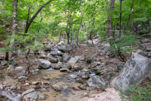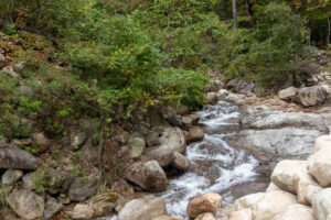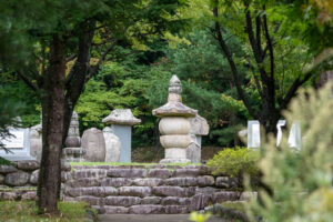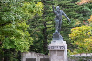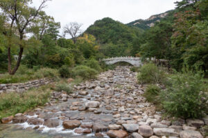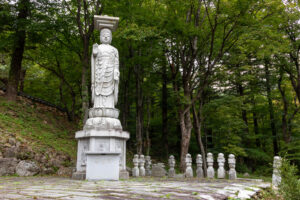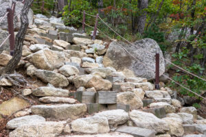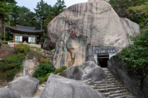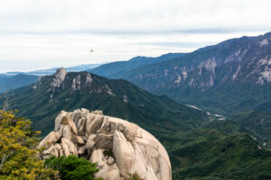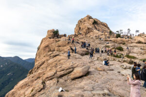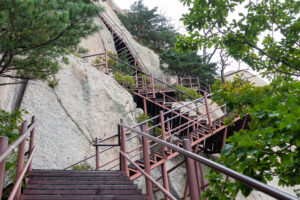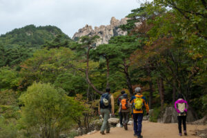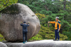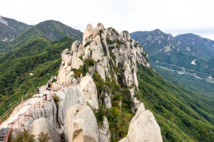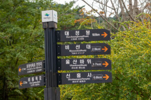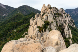 Der Ulsanbawi Rock ist eine riesige Felsformation, die ziemlich markant aus dem grünen Waldmeer herausragt. Am Wegesrand stehen immer wieder interessante Informationen über die Natur und auch über einige Mythen: Direkt hinter der Grenze zu Nordkorea gibt es das „Geumgangsan“ Gebirge. Und die Legende besagt, dass der Schöpfer alle Felsen zur Schaffung der zwölftausend Gipfel des Geumgangsan Gebirges aufgerufen hat. Auch der Ulsanbawi machte sich auf den Weg. Und als es abends dunkel wurde, da legte sich der Berg in den Saoraksan-Bergen zum Schlafen. Am nächsten Morgen erfuhr der große Felsen, dass die 12tausend Gipfel des Geumgangsan Gebirges bereits fertig gestellt sind. Und da es dem Felsen hier so gut gefiel, hat sich der Ulsanbawi-Rock dazu entschieden einfach hier zu bleiben.