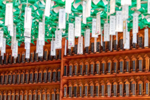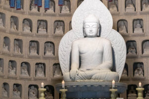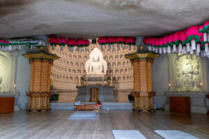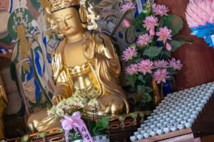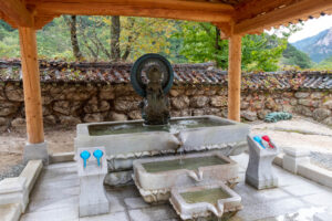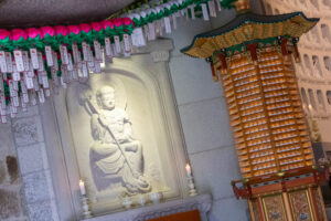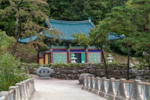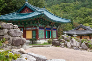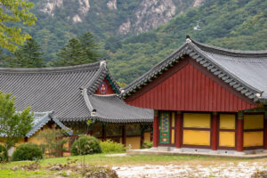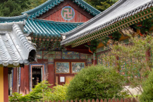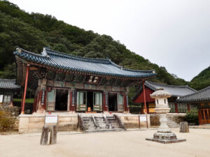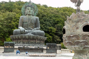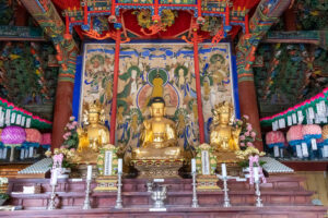 Mein Wecker klingelt heute etwas früher, denn nach dem Frühstück will ich zum Wandern in den Saoraksan National Park. Ein großes bunt bemaltes buddhistisches Tor markiert den Eingang zum Park. In diesem Park gibt es außer Wald und Bergen noch einige Tempel und Pagoden. Einige hundert Meter um den Eingangsbereich herum gibt es einige Restaurants und Café. Auch eine Seilbahn führt von hier auf einen der umliegenden Berge hinauf. Hinter dem ersten Tempel wartet ein riesiger Buddha auf mich. Ich schätze den sitzenden Buddha auf etwa 20m Höhe. Ein paar hundert Meter weiter steht der nächste Tempelkomplex mit mehreren Gebäuden. Die Tempel sind aus Holz und bunt bemalt. Viele Szenen aus dem Leben Buddhas, Und jede Menge Ornamente. In dem ersten großen Tempel stehen drei große sitzende Buddhas und unter der Decke hängen Papierlaternen mit kleinen Zetteln. Ich vermute, dass auf den Zetteln Wünsche stehen. Und das Ganze ist von den steilen grünen Bergen mit den hellen steinernen Gipfeln eingerahmt.