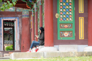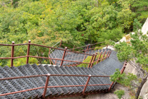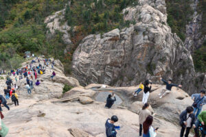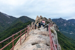 Nach einiger Zeit geht es über Steinstufen weiter bergauf. In einer Höhle ist ein Tempel untergebracht und vor der Höhle steht ein großer Felsen, der auf natürliche Weise so gelagert ist, dass dieser riesige Brocken sogar von einem Menschen bewegt werden kann. So einen Stein nennt man „Logan Stone“. Etwas weiter bergauf, wechseln die Steintreppen zu Metalltreppen. Ab hier geht es die letzten 200 Höhenmeter nur noch über diese Stahltreppen steil an der Felswand bergauf. Oben auf dem Gipfel hat man eine tolle Aussicht die Berglandschaft und auf der anderen Seite ist die Stadt Sokcho und das Ostmeer zu sehen. Aus den Felsen wachsen immer wieder große und kleine Pinien heraus. Weiter unten im Wald wechseln sich Pinien und Eichen ab. Ich wandere den gleichen Weg wieder zurück zu den Restaurants im Eingangsbereich. Dort genieße ich ein Mittagessen und einen Kaffee bevor es dann mit der Seilbahn zur „Festung“ auf den Gipfel in der Nähe geht. Und dort komme ich mal wieder aus dem Staunen nicht mehr heraus. Hier oben auf diesem recht großen Felsen laufen bestimmt mindestens hundert Menschen herum und machen jede Menge Selfies. Direkt am Abgrund! Hier geht es locker einige hundert Meter bergab. Auch kleine Kinder sind dabei. Ich bin sicher, dass es im koreanischen Wortschatz kein Wort für Höhenangst gibt. Ich hab echt Schiss soweit an den Abgrund zu gehen.