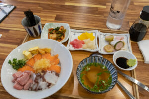 Diesen tollen Wandertag lasse ich mit Sashimi auf dem lokalen Markt ausklingen. Und ganz nebenbei entdecke ich, dass meine Smartphone-App den Währungskurs falsch umgerechnet hat. Somit kostet jetzt der große Kaffee nicht mehr 6,-€ sondern nur noch 3,-€. Jetzt sehe ich die Preise in Südkorea doch aus einem ganz anderen Licht.