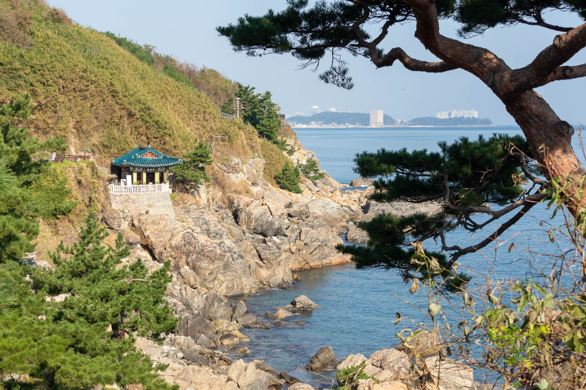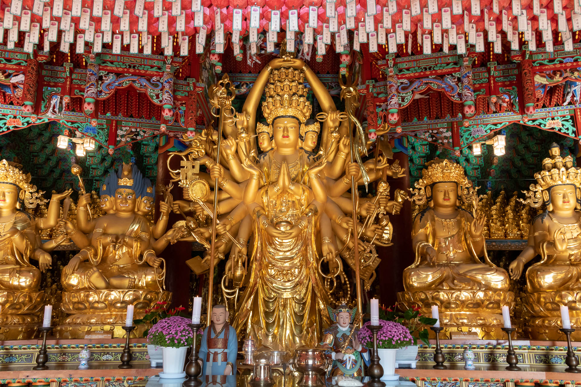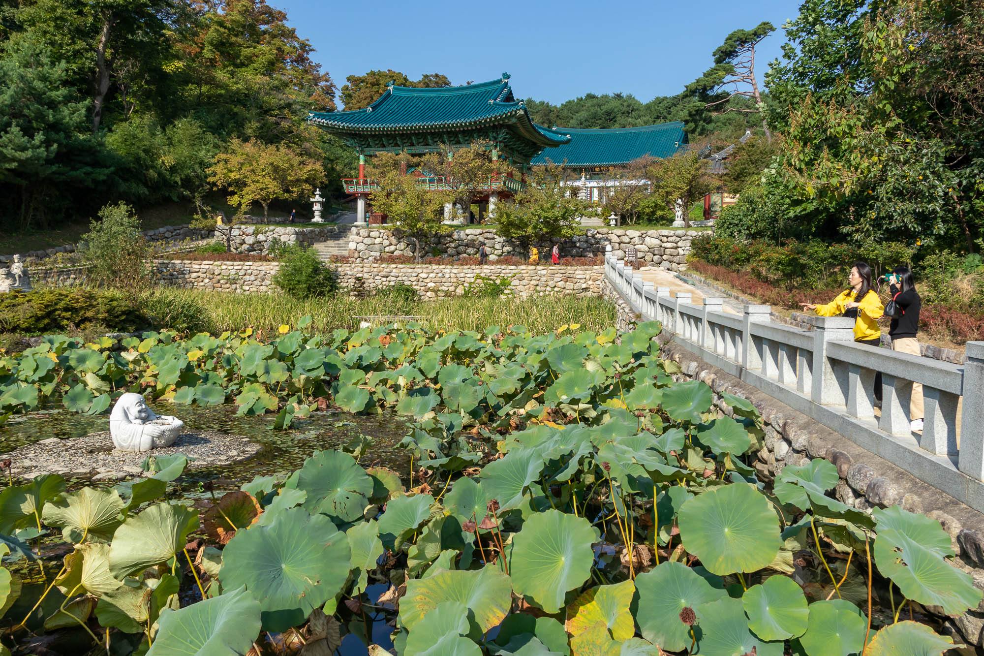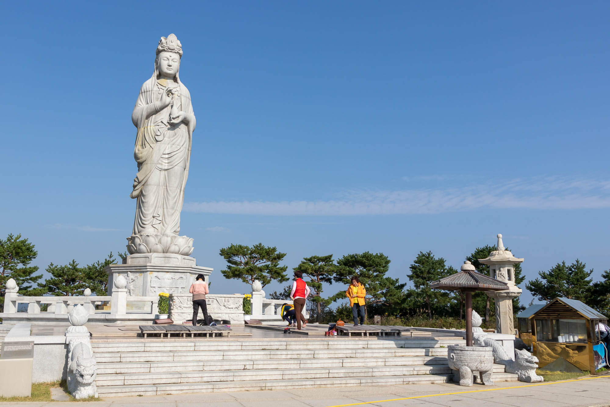 Heute morgen kann ich länger schlafen. Trotzdem bin ich schon um 7Uhr wach. Nachdem ich meinen Rucksack wieder gepackt habe und das einfache Frühstück im Hostel aus Toast, Butter, Käse und Marmelade genossen habe, fahre ich wieder mit dem Bus zu meinem nächsten Sightseeing-Punkt. Nur eine halbe Stunde entfernt liegt direkt am Meer der Naksansan-Tempel. Hinter dem Eingangstor erwartet mich eine große Parkanlage in den Hügeln am Meer. Wunderschöne kleine und große Tempel liegen mit wunderschönen Malereien verziert zwischen Hügeln und kleinen Teichen. Die Schnitzereien an den Tempelgebäuden stellen Drachen da und die vielen Holzbalken und Wände sind mit unzähligen Malereien versehen. Das ist bis  jetzt die schönste Tempelanlage, die ich in Korea gesehen habe. Im Haupttempel sitzen fünf große goldene Buddhas vor denen einige Menschen beten. Eingerahmt sind diese großen goldenen Buddhas von vielen kleinen goldenen Buddhas. Von der Decke hängen hunderte Papier-Laternen dicht an dicht. Ein kleinerer Tempel dieser Anlage liegt direkt an die Felsen gebaut am Meer. Als ich diesen Tempel besuche hält ein Mönch gerade eine Andacht mit buddhistischer Musik und Gesang. Von Außen hört man das Rauschen des Meers unterhalb des Tempels. Eine faszinierende Stimmung! Und dann werde ich noch auf einen Tee eingeladen, denn die Mönche schenken kostenlosen Tee aus. Auf der höchsten Erhebung steht eine etwa 10-12m hohe stehende Buddhafigur und überblickt die gesamte Tempelanlage und schaut entlang der Küste gen Süden. Nicht weit entfernt von diesen wunderschönen Tempeln erstreckt sich ein weitläufiger Sandstrand auf dem gerade Filmaufnahmen laufen.