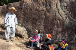 Langsam ansteigend führt der Weg weiter nach oben. Ich bin noch vorsichtig mit dem Muskelkater in meiner rechten Wade. Im Wald gibt es immer wieder kleine Tempel oder steinerne Buddhas. An einigen Felsen sind auch riesige Buddhas in den Fels gehauen und jahrhunderte oder gar tausend Jahre alte buddhistische Graffiti. Auf dem Weg ist ganz schön was los. Gruppen mit mehr als 20 Personen sind hier im Wald unterwegs. Inkl. großem Mittags-Picknick. Weiter oben hat man aber auch eine tolle Aussicht auf die Stadt Gyeongju. Und die zahllosen Berge um die Stadt herum. Im Tal unter mir sehe ich ebenso zahllose Felder und kleine Dörfer. Der Gipfel ist ziemlich unspektakulär. Der Gipfel ist nur eine Lichtung mit einem Felsen mit Inschrift als Markierung. Hier oben mache ich eine kleine Pause und tausche ein bisschen Proviant mit einem jungen Koreaner, dem ich auf dem Weg immer wieder überholt habe, nachdem ich eine Fotopause gemacht habe. Die meisten der anderen Wanderer gehen den gleichen Weg wieder zurück. Ich nehme einen anderen Weg und freue mich später, dass dieser Teil der Weges nicht so überlaufen ist wie beim Aufstieg. Hier sind auch ziemlich viele Libellen unterwegs und einige Eichhörnchen sehe ich. Und leider auch einen Rettungshubschrauber, der einen verletzen Wanderer gerettet hat der wohl mit einem gebrochenen Fuß ins Krankenhaus gebracht wird. Danach ist es wieder still im Wald und ich kann das Plätschern des Bachs hören während ich meinen Weg weiter durch den Wald fortsetze. Was für eine schöne Wanderung!