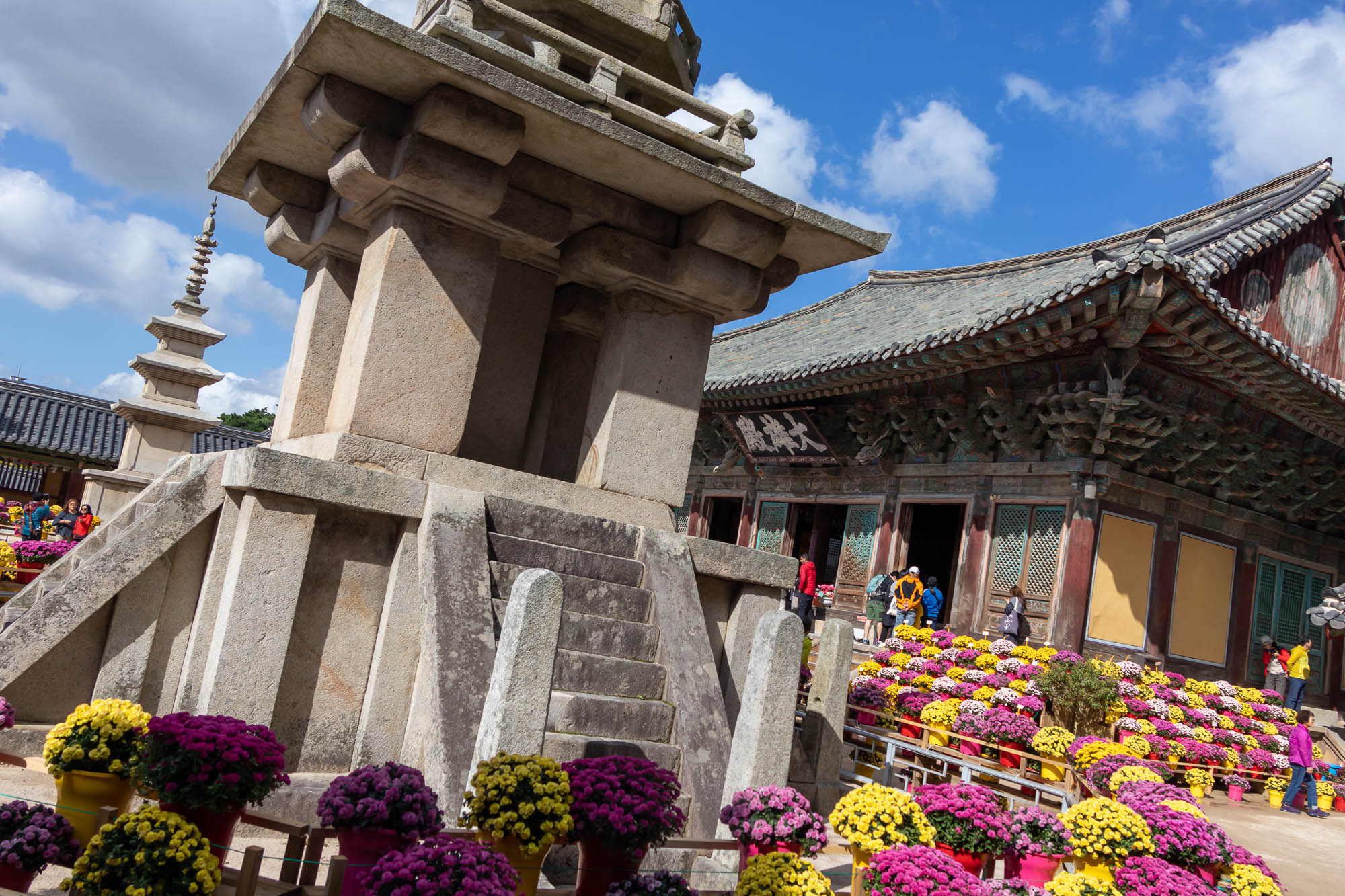 Heute morgen muss ich nach dem Frühstück erst einmal einen Geldautomaten finden. Ich bin blank. Die ersten drei Geldautomaten lehnen meine Karte ab. Dann frage ich an Bahnhof nach einem ATM und werde an den kleinen Supermarkt nebenan verwiesen. Auch dort wird meine Karte abgelehnt. Aber ich bin hartnäckig und versuche es ein weiteres Mal. Zuerst auf „foreign card“ oder zuerst die Sprache auf Englisch umstellen? Keine Ahnung was ich gemacht habe, aber der Automat spukt dann doch ein paar hunderttausend Won aus. Also kann es jetzt losgehen. Ich fahre mit dem Bus zum Bulguksa Tempel und unterhalte mich während der Fahrt mit einem Koreaner, der gerade auf dem Weg zu einer Hochzeitsfeier ist.