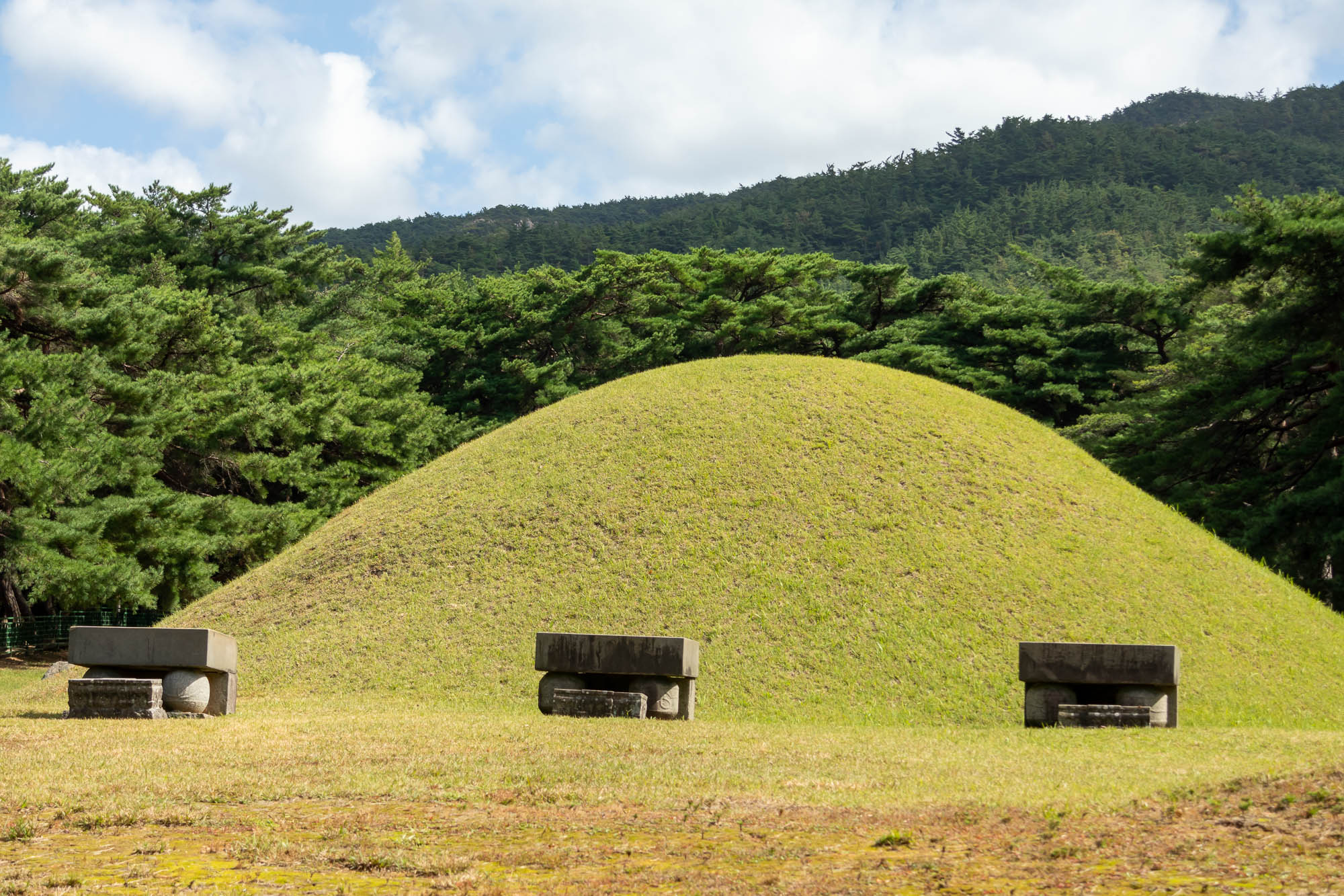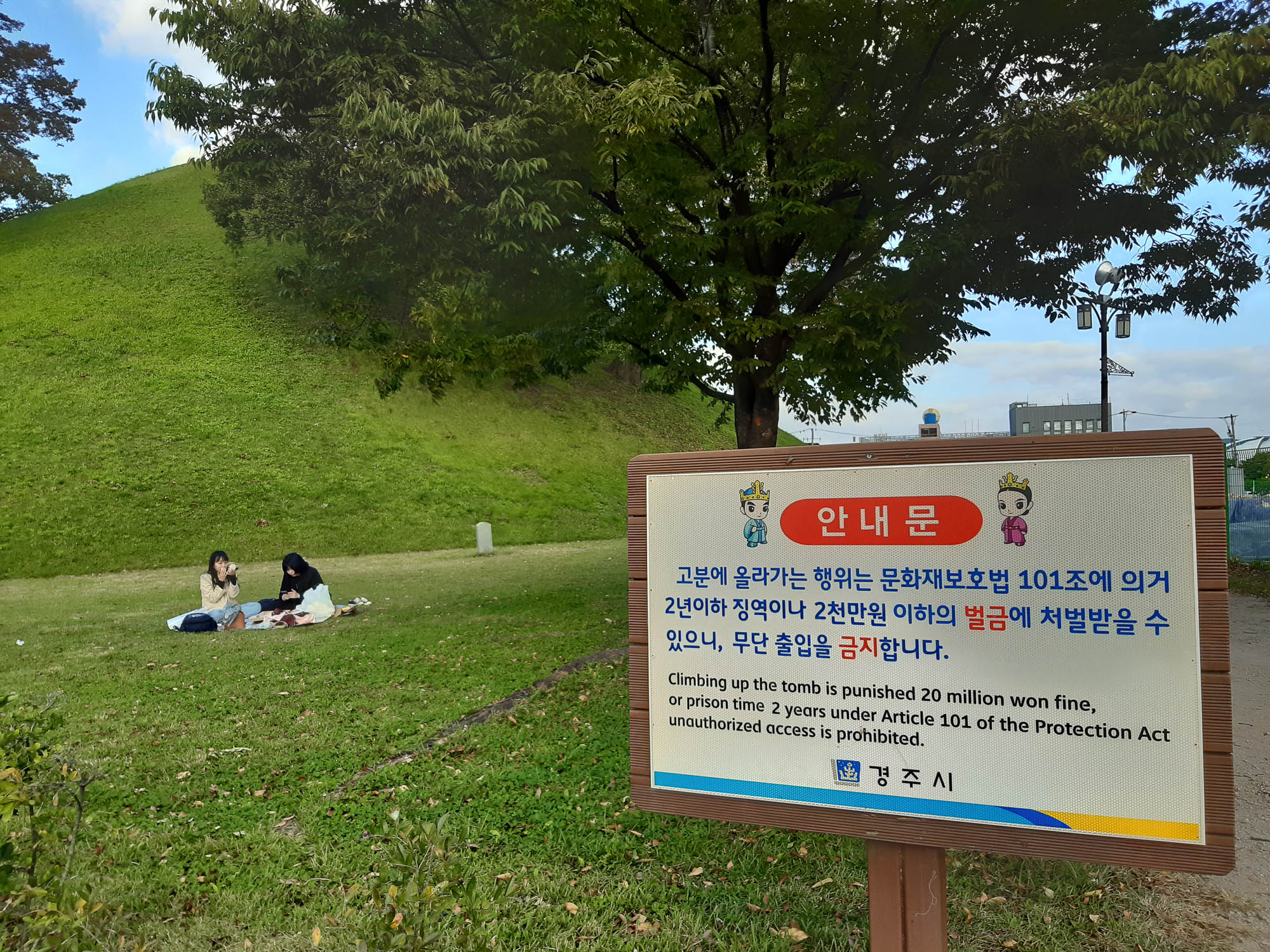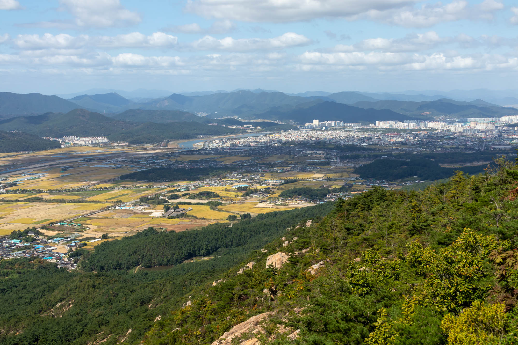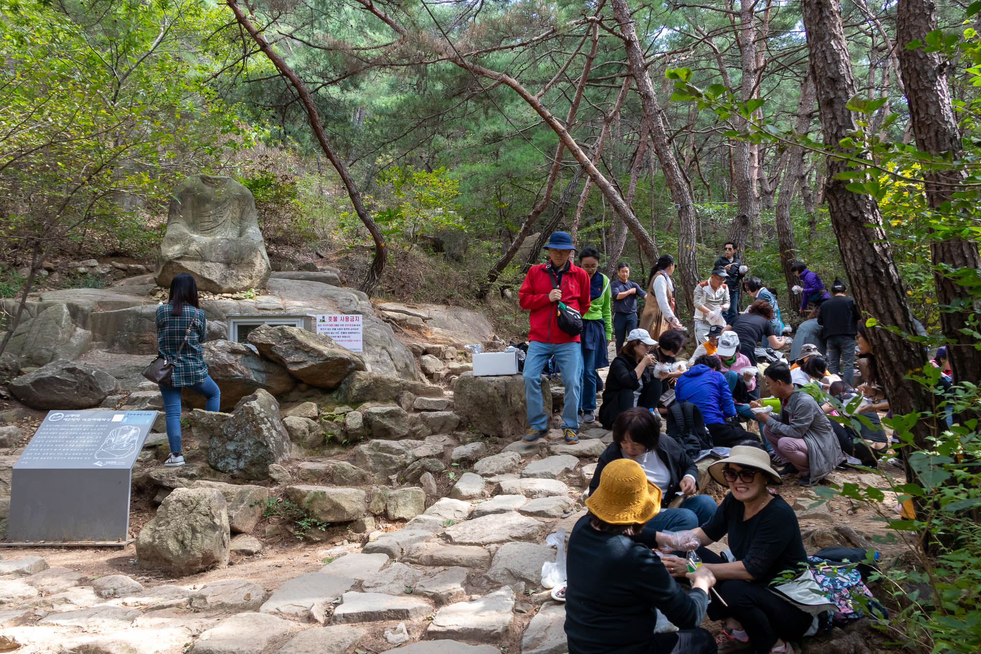 Langsam ansteigend führt der Weg weiter nach oben. Ich bin noch vorsichtig mit dem Muskelkater in meiner rechten Wade. Im Wald gibt es immer wieder kleine Tempel oder steinerne Buddhas. An einigen Felsen sind auch riesige Buddhas in den Fels gehauen und jahrhunderte oder gar tausend Jahre alte buddhistische Graffiti. Auf dem Weg ist ganz schön was los. Gruppen mit mehr als 20 Personen sind hier im Wald unterwegs. Inkl. großem Mittags-Picknick. Weiter oben hat man aber auch eine tolle Aussicht auf die Stadt Gyeongju. Und die zahllosen Berge um die Stadt herum. Im Tal unter mir sehe ich ebenso zahllose Felder und kleine Dörfer. Der Gipfel ist ziemlich unspektakulär. Der Gipfel ist nur eine Lichtung mit einem Felsen mit Inschrift als Markierung. Hier oben mache ich eine kleine Pause und tausche ein bisschen Proviant mit einem jungen Koreaner, dem ich auf dem Weg immer wieder überholt habe, nachdem ich eine Fotopause gemacht habe. Die meisten der anderen Wanderer gehen den gleichen Weg wieder zurück. Ich nehme einen anderen Weg und freue mich später, dass dieser Teil der Weges nicht so überlaufen ist wie beim Aufstieg. Hier sind auch ziemlich viele Libellen unterwegs und einige Eichhörnchen sehe ich. Und leider auch einen Rettungshubschrauber, der einen verletzen Wanderer gerettet hat der wohl mit einem gebrochenen Fuß ins Krankenhaus gebracht wird. Danach ist es wieder still im Wald und ich kann das Plätschern des Bachs hören während ich meinen Weg weiter durch den Wald fortsetze. Was für eine schöne Wanderung!