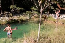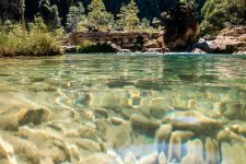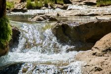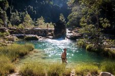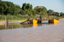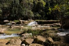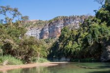 Nach unserem Frühstück wartet eine kleine Überraschung auf uns. Wir paddeln etwa 20min einen kleinen Fluss hinauf. Das Wasser im Fluss ist absolut klar im Gegensatz zum sandig braunen Wasser im Manambulo. Wir wandern oder besser klettern noch etwa eine halbe Stunde das felsige Flussbett entlang. Bei einem kleinen Wasserfall erreichen wir unsere Überraschung: unser Swimmingpool. Das Wasser ist erfrischend und glasklar. Die Erfrischung tut gut. Nach einem ausgibiegen Bad vermisst Norbert seine Brille und wir suchen bestimmt eine Stunde nach ihr. Aber sie ist irgendwo in unserem tiefen Pool verloren gegangen. Wie als Entschädigung für die verlorene Brille flattern um uns herum viele Schmetterlinge in bunten Farben. Entspannung pur: ein bisschen Sonne tanken, ein bisschen planschen. Und dann finden wir doch noch die Brille von Norbert.