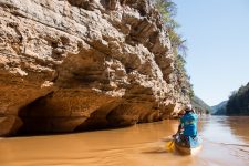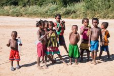 Nach unserem Mittagessen geht es mit den Kanus weiter durch die Schlucht in Richtung Bekopaka. Faszinierend wie sich der Fluss durch das Gestein gegraben hat. Und auf jeder kleinen freien Fläche holt sich Urwald sein Grund und Boden zurück. Die Formationen des Gesteins sind beeindruckend. Kleine Tunnel, Höhlen, Felsen. Und dazwischen immer wieder Bäume. Direkt an den steilen Hängen wachsen sie aus irgendeinem Loch heraus in die Höhe. Als wir nach etwa zwei Stunden die Schlucht durchquert haben sind wir auch schon direkt an unserem Hotel angekommen. Mit Blick auf den Manambulo. Und sofort sind alle Kinder aus dem Dorf bei uns.