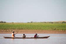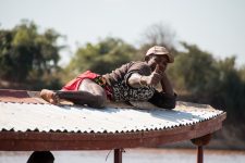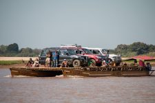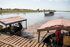 Nach dem Essen geht’s zur Fähre. Oder was man irgendwie Fähre nennen kann. Eigentlich sind es nur zwei Boote mit einem Deck aus Brettern auf dem wir unser Auto parken. Die Überfahrt geht erst den Fluß ein Stück hinauf und dann in einem anderen Arm wieder hinab. Wir sind in einem Fluss-Delta. Die beiden Motoren der einzelnen Boote sind extrem laut. Ich verzieh mich in den vorderen Teil unserer Fähre und genieße den kühlenden Fahrtwind.