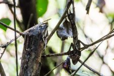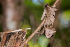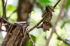 Es ist sehr sehr feucht und kühl. Und es ist überall grün. Unser erstes seltsames Subjekt entdeckt unser Guide bereits nach wenigen Minuten: ein vertrocknetes Blatt. Dafür halten wir es zumindest. Aber bei genauem Hinsehen hat das Blatt zwei Augen und hängt zwischen zwei Ästen. Ein getarnter Gecko. WOW!
