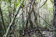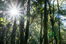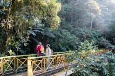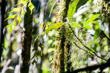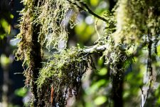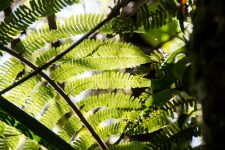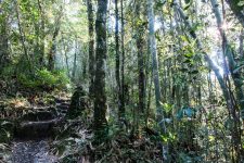 Um uns herum ist es dicht an dicht grün bewachsen und es wuchert überall. Verschiedene Bäume, Große und Kleine, Farne und Moose überall. Von den Bäumen hängen Lianen und andere Pflanzen herab. An einigen Stellen können wir nur wenige Meter in das grüne Dickicht hineinschauen. Wir streifen auf matschigen und rutschigen Wegen durch den Regenwald. An einigen Stellen schaffen ein paar Sonnenstrahlen das grüne Blätterdach zu durchbrechen. Ein wunderschönes Spiel aus Licht und Schatten.