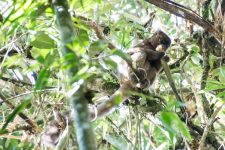 Unser Spotter ist bereits voraus gelaufen. Und dann ein Anruf unseres Spotters bei unserem Guide: „Lemuren gesichtet!“ Ach wie praktisch kann Handyempfang im Regenwald sein. Wir machen uns auf den Weg. Teilweise geht es quer durch das Dickicht vorbei an Schlingpflanzen und Bambus. Und dann sehen wir ihn auch schon: einen kleinen Bambus-Lemur beim Frühstück. Er knabbert an einer Bambus-Stange herum. Ziemlich knuddelig wie er dort oben im Baum sietzt.
