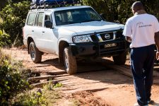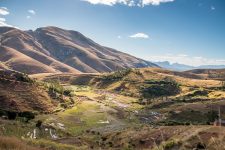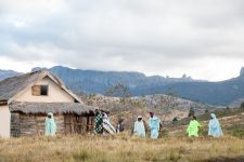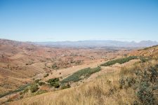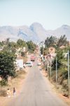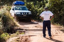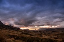 Weiter geht die Fahrt auf einer unbefestigten Piste für die nächsten 3,5 Stunden. Einige Brücken sehen sehr baufällig aus, aber unser Fharer Cesar managt jedes Hindernis. Es geht stetig bergauf durch die hügelige und felsige Landschaft. Die Sonne geht langsam unter als wir am Parkeingang ankommen. Wir treffen unsere Träger und fahren noch ein Stück weiter in Richtung Gebirge, dass vor uns in den Abendhimmel wächst. Der Sonnenuntergang ist faszinierend schön an diesem Ort. Die Sonne spielt mit den Wolken und den Berggipfeln.