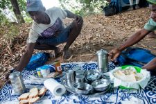 Nach dem Mittagessen schauen wir uns auf dem Weg zu unseren Kanus noch eine kleine Rum-brennerei an. Hier wird direkt am Rand der Zuckerrohr-Plantage der Schnaps in Fässern gebrannt und in Cola-Flaschen abgefüllt.