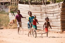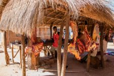 Nach einer Weile heißt es für uns: Schuhe aus und ab ins Wasser. Es geht durch einen flachen Fluss. Der Sand im Fluss leuchtet im frühen Sonnenschein als ob dort kleine Goldstücke schwimmen. Kurze Zeit später kommen wir in dem Städtchen Ankavandra an. Hier ist der Start für unsere Kanu-Tour. Wir müssen noch auf unsere Kanus warten und beobachten solange den Trubel auf der Hauptstraße. Wobei es keine Straße ist,  sondern eigentlich nur ein Weg aus Sand. Nicht nur für die vielen Kinder sind wir eine Attraktion in dem Dorf. Wir sind die einzigen Weißen in dieser Gegend und das wahrscheinlich seit Wochen. Und langsam hat es sich auch in der ganzen Stadt herumgesprochen und so kommen immer mehr Kinder und Jugendliche um uns zu sehen. Und damit wir Fotos von Ihnen machen. Die Kids posen wie richtige Models extra für uns. Da wir noch viel Zeit bis zum Mittagessen und bis zu unserer Abfahrt mit den Kanus haben,  mache ich noch eine kleine Sightseeing-Tour in der kleinen Stadt.  Gleich um die Ecke ist der große Marktplatz und direkt nebenan der Markt. Auf dem Markt gibt es frisches Gemüse und Teigwaren. Auch halbe Zebus hängen hier an den Ständen zum Verkauf. Selbst die Klauen werden werden angeboten.