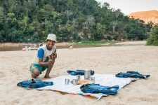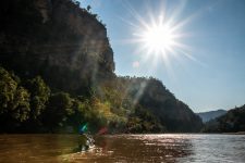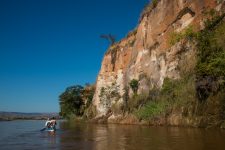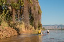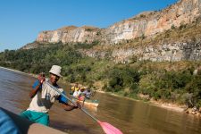 Ich hab mir eine Erkältung eingefangen und schlafe ein wenig im Schatten. Erkältung in Afrika bei 30grad im Schatten. Naja, wir sind ja auf der Süd-Halbkugel und somit im Winter. Und zu einem Winter gehört auch eine Erkältung. Nach der Mittagspause erreichen wir nach etwa einer Stunde den Eingang zu einer Schlucht. Mein madagassischer Steuermann stimmt ein Lied an und wir treiben langsam in die Schlucht hinein. Wow! Ich bin beeindruckt. Das ist wunderschön. Der Gesang und neben uns steigen 100m oder vielleicht auch 200m hohe Felswände empor. An einigen Felskanten wachsen Bäume und das Echo ist richtig toll. Die Tierstimmen werden auch immer vielfältiger und lauter. Auch deren Echo hören wir immer wieder. Ab und zu kommen uns jetzt auch ein paar Reisende auf Einbäumen entgegen. Bisher waren wir fast immer die einzigen Reisenden auf dem Wasser. Unser Nachtlager schlagen wir wieder auf einer Sandbank auf. Aber dieses mal mitten in der Schlucht. Um uns herum erstreckt sich ein Dichter Wald senkrecht an den Felsen empor. Während unser Team das Abendessen vorbereitet genieße ich das Konzert der Tiere. Wow! Ich bin immer noch schwer beeindruckt. Auch die Nacht ist voller Tierstimmen.