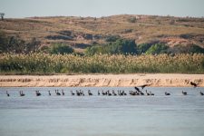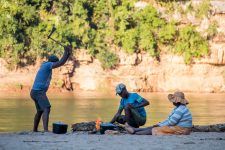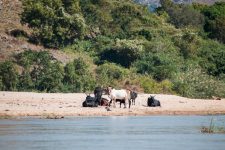Der Fluss wird breiter und die Strömung schneller. Aber trotzdem laufen wir noch ab und zu auf Grund. Allerdings nicht mehr so häufig wie die letzten Tage. Wir nähern uns immer mehr den nächsten Bergen und um uns herum stehen mehr und mehr Bäume am Ufer. An den Rauchschwaden hinter dem Schilf oder den Bäumen kann man sehen wo es kleine Dörfer oder Siedlungen gibt. An einem Dorf kommt sofort viele Bewohner ans Ufer uns ein kurzer Handel entsteht. Zum Mittagessen gibt es dieses Mal Nudeln mit Tomatensauce.