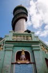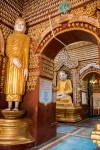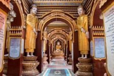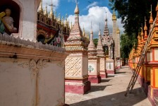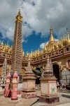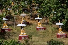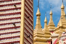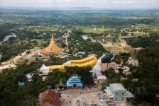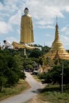 Heute machen wir einen Tagesausflug nach Monywa zu den größten Buddha-Figuren der Welt. Wir verlassen Mandalay durch die wohl ärmsten Gebiete der Stadt. Hier leben die Menschen in Strohhütten direkt an der Straße oder auf dem Mittelstreifen. Kurze Zeit später überqueren wir den Irrawady über eine riesige Brücke. Der Fluss ist hier bestimmt 3km breit. Etwas entfernt ist noch eine weitere Brücke über den Fluß. Wir fahren auf der neuen Brücke, die von den Chinesen gebaut wurde und können die alte Brücke in einiger Entfernung sehen, die von den Briten gebaut wurde. Auf der anderen Seite sehen wir wieder viele goldene Pagoden aus dem kräftigen Grün des tropischen Waldes emporragen.