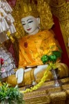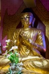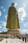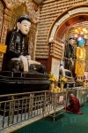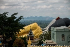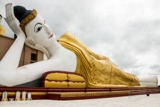 Auf unserer Fahrt durch unzählige Plantagen und Felder beobachten wir den ziemlich interessanten Verkehr in Myanmar. Nicht nur, dass hier alles auf der Straße fährt was sich irgendwie bewegen kann, auch fast alle Busse sind auch auf dem Dach mehr als vollgepackt. Auch mit Menschen. Diese Reisenden zeigen dem nachfolgenden Fahrzeugen auch mit Handzeichen an, ob überholt werden kann oder nicht. Die Sicht für den Fahrer ist mehr als schlecht, da er nicht in den Gegenverkehr schauen kann. Vor ein paar Jahren wurde in Myanmar der Verkehr von Linksverkehr auf Rechtsverkehr umgestellt. Aber fast alle Fahrzeuge haben das Lenkrad auf der rechten Seite. Keine Chance für den Fahrer in den Gegenverkehr zu schauen. Nach 2,5 stündiger Fahrt sehen wir den großen Buddha! Er ist 137m hoch. Und von innen begehbar. Vor dem großen stehenden Buddha liegt ein ebenso großer schlafender Buddha. Wir machen uns an den Aufstieg und werden wieder einmal von den Birmanen bestaunt. Hier sehen wir auch nur vier andere Touristen und man macht wieder einmal gerne Fotos mit uns. Auf jeder Etage innerhalb des großen Buddhas sind Szenen aus dem leben Buddhas und andere buddhistische Legenden an die Wände gemalt. In der Mitte stehen jeweils vier Buddhas mit Blick in alle Himmelsrichtungen.