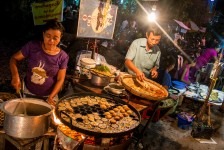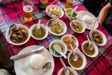 Zum Essen geht es in ein lokales birmanisches Restaurant. Es gibt Kalbs-Curry, Linsen, Reis, Grünkohlsuppe, Kartoffeln, Nudeln, Gemüse, und noch vieles mehr. Zum Nachtisch gibt es einen original birmanischen Salat: man gibt sich aus einer Schüssel etwas geröstete Erdnüsse, Ingwer und grünen Tee auf die Hand und ist dieses Gemisch. Es schmeckt wunderbar!