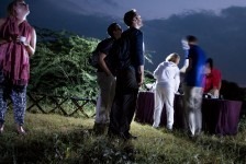Als nächstes müssen Wir unbedingt noch eine Kokosnuss vernaschen. Das haben wir uns schon seit Tagen vorgenommen. Und dann machen wir uns mit den Rädern durch die Büsche auf teilweise tiefen, sandigen Wegen auf zu unserer Sonnenuntergangs-Pagode. Natürlich sind wir nicht die Einzigen, aber der Tempel ist nicht so überladen mit Bus-Touristen wie am Vortag. Wie immer weisen uns einige Souvenir-Verkaufende-Kids den Weg nach oben. Und wieder will die Sonne nicht mitspielen: pünktlich zum Sonnenuntergang schieben sich Wolken vor die Sonne. Wir quatschen derweil noch mit einigen Schweizern bevor wir uns im Dunkeln auf den Weg nach Hause machen. Wir nehmen die Abkürzung vom Vortag quer durch die Pagoden-Felder über steinige und sandige Wege nach Neu-Bagan. Doch der Weg wird uns hell erleuchtet: über Bagan blitzt und donnert es aus vollen Stücken. Ein großes Gewitter ist direkt über uns. Wenige Meter neben uns geht direkt ein Blitz runter: es blitzt taghell und knallt im gleichen Moment so laut, dass wir fasst vom Fahrrad fallen. Das löst erst recht Adrenalin bei uns aus. Buddha-sei-Dank regnet es nicht. Es tröpfelt nur ein wenig und wir radeln mit unseren klappernden Mountainbikes durch die dunklen Büsche von Myanmar und neben uns kracht und blitzt es aus vollen Rohren! WOW!! Das ist heftig! Wir sind froh als wir wieder in Neu-Bagan ankommen! Unser erstes Bier im Black-Rose geht runter wie Öl. Und nun fängt es auch heftig an zu regnen. Und dann…. BOOOM! Der Strom ist weg. „Ganze Straße dunkel!“ Und wahrscheinlich auch noch mehr. Aber wir haben von unserer Tour noch unsere Stirnlampen parat und Essen genüsslich weiter. Von einigen Deutschen am Nachbartisch hören wir nur: „Schau an! Die Jungs machen’s richtig!“ Wir sitzen im Trockenen und haben etwas sehr sehr leckeres zu Essen auf dem Tisch und dazu noch kaltes Myanmar-Bier. Dann darf es draußen auch regnen. Eine Regenpause nutzen wir um mit den Rädern zum Hotel zufahren. Es geht um riesengroße und wahrscheinlich auch Tiefe Pfützen herum. Es gewittert in der Nacht weiter und im Hotel ist auch von Zeit zu Zeit der Strom weg.