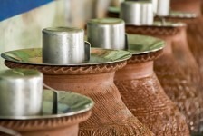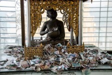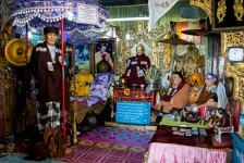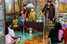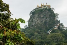 Ausschlafen. Zumindest bis 7 Uhr. Heute ist unser letzter Tag in Bagan und wir haben uns für 8 Uhr ein Taxi zum Mount Popa gebucht. Der Mount Popa ist ein Berg der buddhistischen Mythologie und liegt etwa 1,5 Stunden von Bagan entfernt. Unser Gepäck können wir im Hotel lassen und der Direktor bietet uns freundlicherweise an am Nachmittag noch im Pool zu relaxen bis um 18Uhr unser Pickup zum Nachtbus nach Yangon kommt. Das nehmen wir gerne an. Aber erstmal führt uns unser Weg zum Mount Popa. Unser Taxifahrer baut auch wieder die bewährten Touristen-Stops ein: bei einem Palmöl-Bauern können wir zusehen, wie die Jungs auf die Palmen klettern um die Töpfe mit dem aufgesammelten Palmsaft einzusammeln. Zu kaufen gibt es alles vom Palmöl über Süßigkeiten, Palmwein bis zum selbstgebrauten Palmschnaps. Probieren wollen wir diesen lieber nicht. Die Route zum Mount Popa führt durch zahlreiche Felder und an Unmengen Palmen zur Herstellung von Palmöl. Der Mount Popa selbst ragt als steiler Felsen aus dem grünen Tropenwald empor. Auf dem Gipfel wiederum ragen die golden Dächer der Pagoden und Tempel empor. Der Anblick hat schon etwas mystisches. Zum Gipfel gelangt man wiederum nur über Treppenstufen. Hier laufen und klettern hunderte von Affen herum, die von einigen Besuchern gefüttert und von Anderen beworfen werden. Da diese Affen natürlich auch hinscheissen wo sie wollen sind die Treppenstufen auf entsprechend verdreckt. Da Tempelanlagen und andere heilige Stätten aber nur barfuß betreten werden dürfen müssen wir schon aufpassen wo wir hintreten. Wohl alle 2-3 Meter sitzen Burmesen mit Wischer und Lappen und putzen die Treppen. Für eine kleine Spende natürlich.