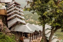 Vom Gipfel haben wir einen weiten Blick über die unter uns liegende Ebene und auf den gegenüberliegenden erloschenen Vulkanberg. Dort lassen wir uns im Anschluss auch noch hinbringen. An der Bergflanke ist ein großes Hotel-Ressort gebaut worden inkl Reitstiation und Swimmingpool mit Blick auf den Mount Popa.