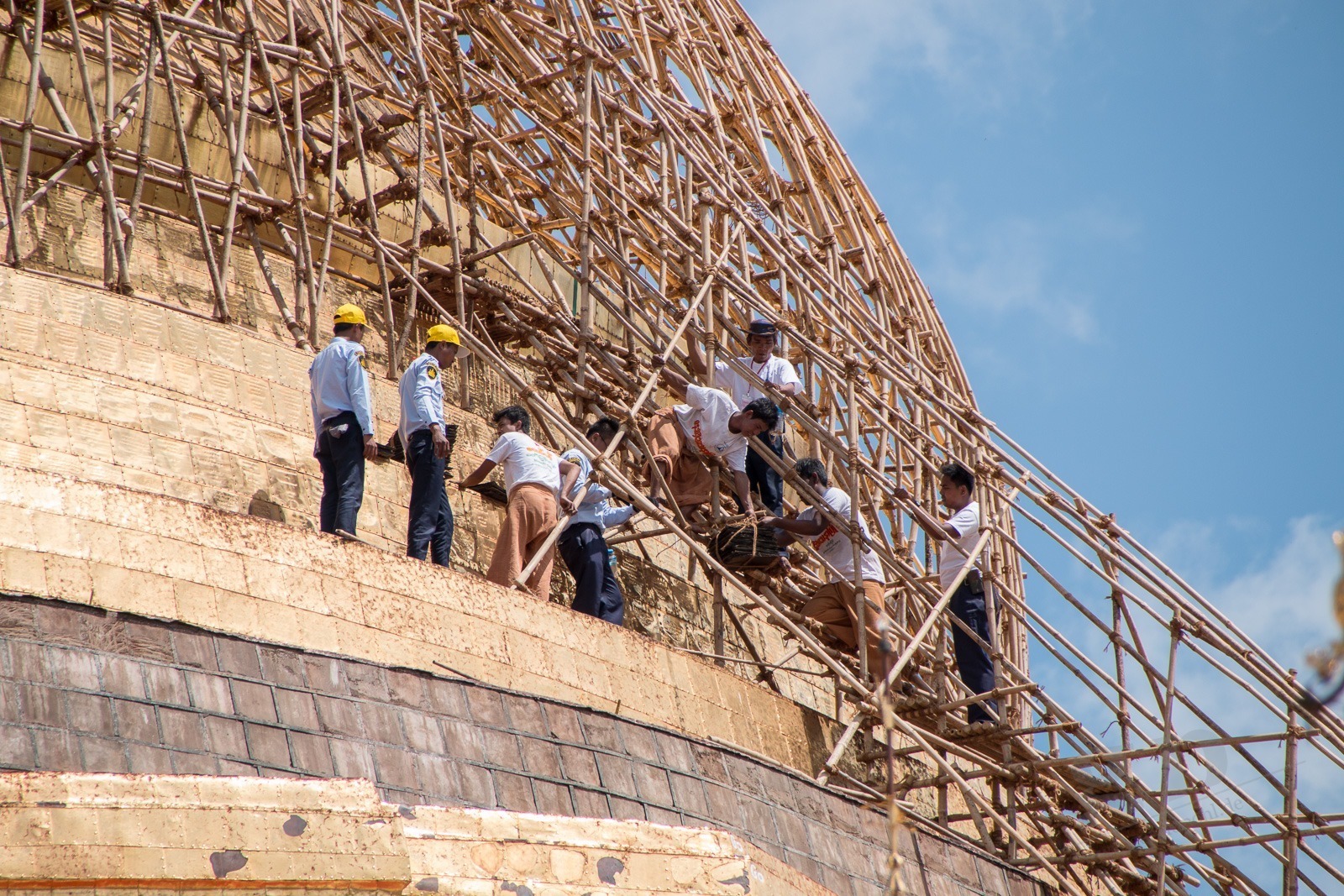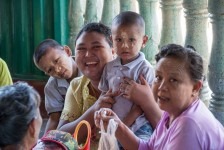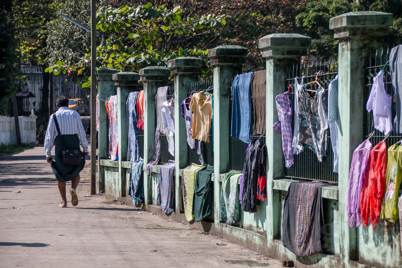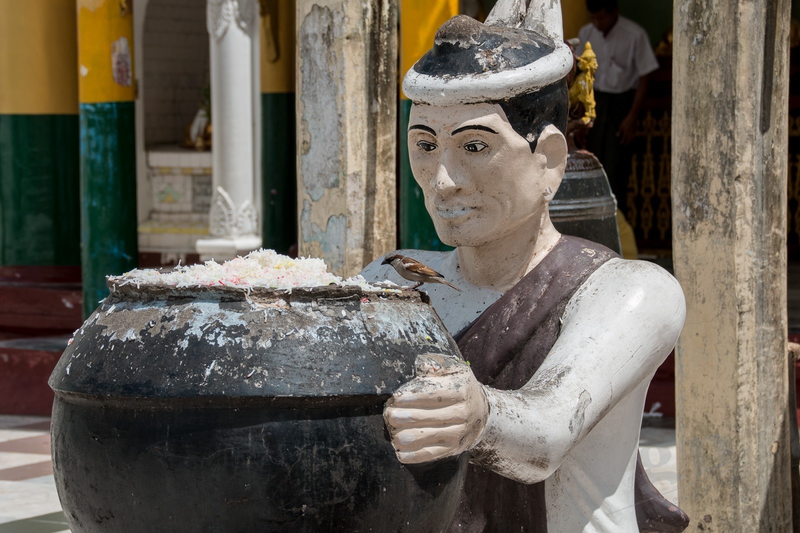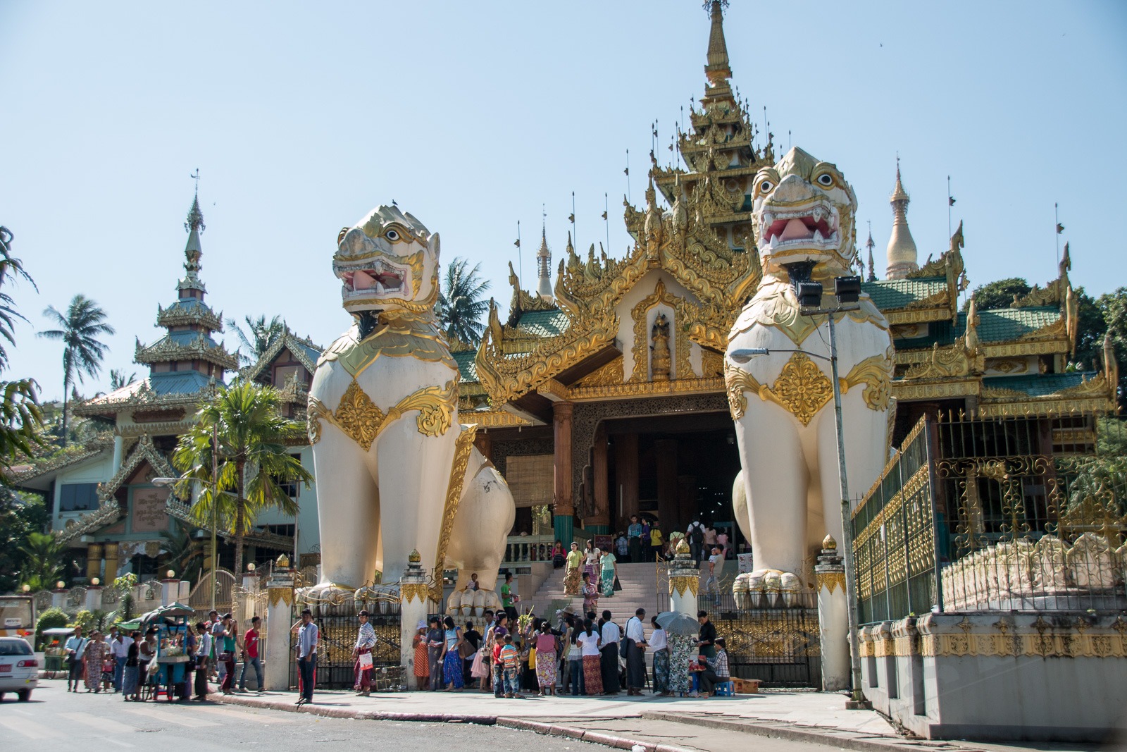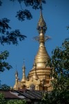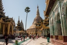 Ausgeschlafen starten wir mit einem traditionellen Frühstück aus Reis, Huhn, Gemüse und Ei in den Tag. Dazu gibt es einen viel zu süßen Kaffee: Coffee-Mix. Wir machen uns zu Fuß auf den Weg zur Shwedagon-Pagode. In der Pagode sind, wie in alles religiösen Stätten, Schuhe verboten und die Beine müssen bedeckt sein. Also kaufen wir zu unserem Ticket gleich noch ein Wickeltuch für unsere Beine: Ein Longyi. Wir müssen durch eine Sicherheitsschleuse wie im Flughafen. Mit dem Unterschied, dass es hier bei jedem piept und niemand weiter kontrolliert wird. That’s Myanmar. Das ist übrigens im Supermarkt genauso: am Eingang werden wir kontrolliert und gescannt, es piept mehrmals und wir dürfen durchgehen.