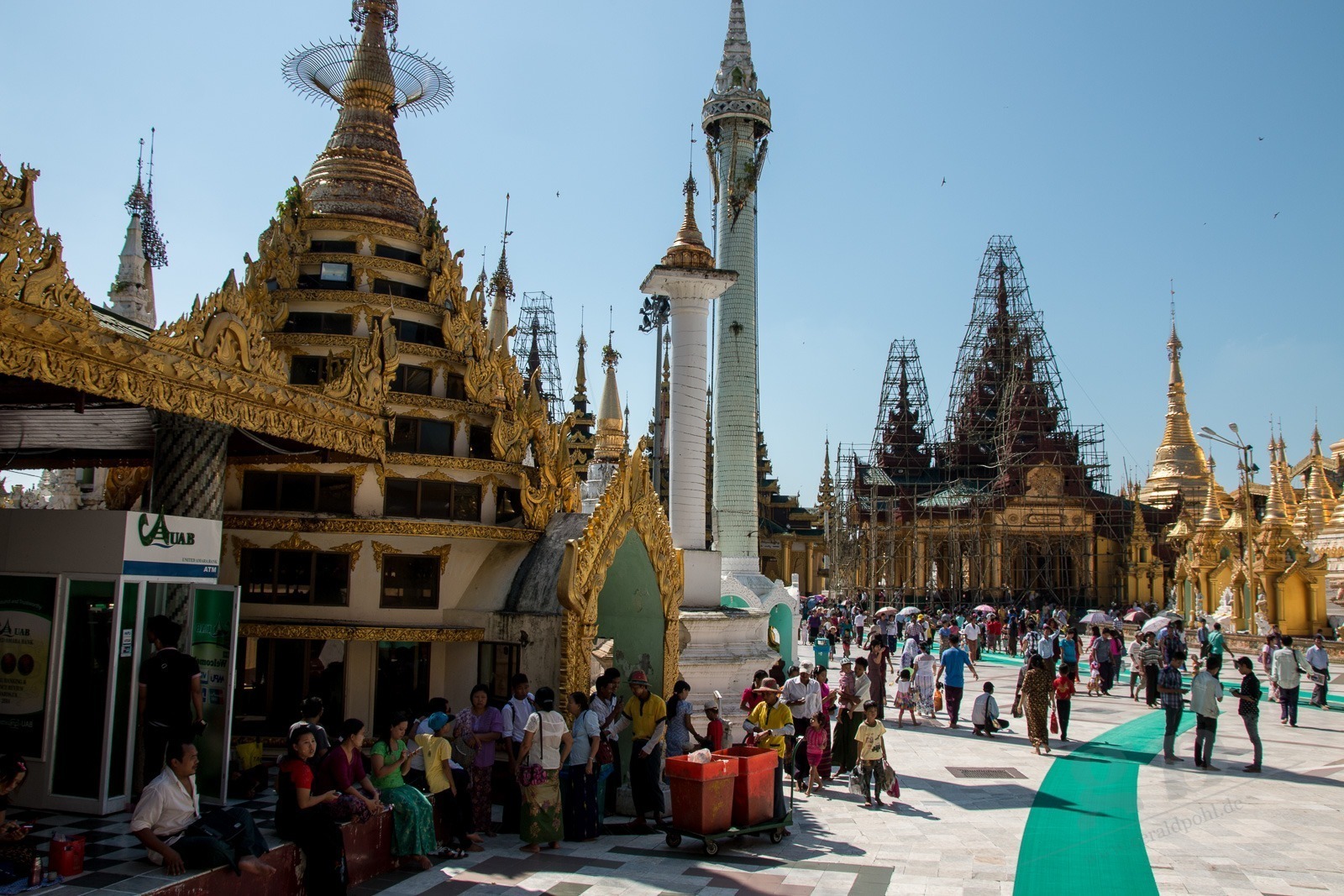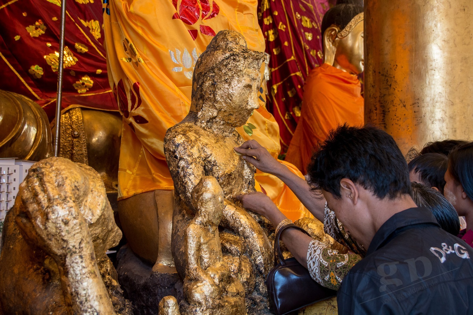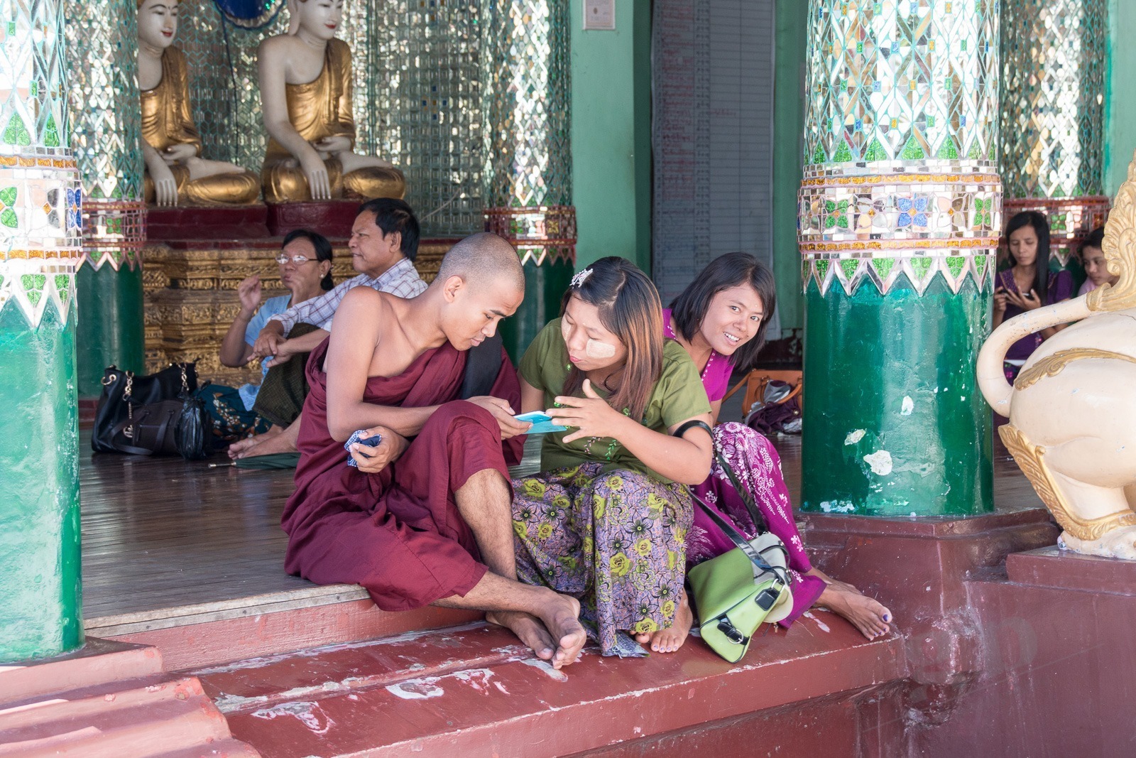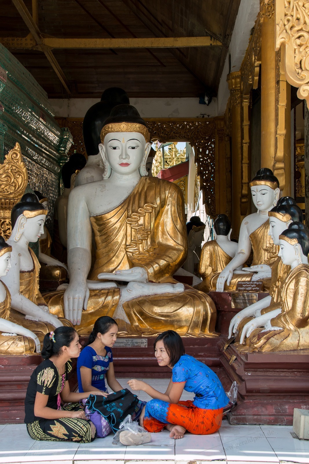 Wir steigen die lange Treppe zur Pagode hinauf. Und ab jetzt geht unser Mund nicht mehr zu. Wir kommen aus dem Staunen nicht mehr heraus. Gold und Buddhas. Und noch mehr Gold und noch mehr Buddhas. Wir werden von einer Frau angesprochen, ob sie uns durch die Pagode führen darf. Aber gerne doch! Unser Guide führt uns an unseren persönlichen Schreinen vorbei, denn jeder Wochentag hat hier eine eigene Ecke: Die Birthday-Corner. Wir sind beide an einem Freitag geboren und jeder Wochentag hat einen eigenen Schrein. Natürlich aus Gold. Die Kuppeln der riesigen Tempel sind aus Gold. Die Buddhas sind aus Gold. Wir sehen fast keine Touristen an diesem Ort. Wir werden sogar von Einheimischen fotografiert. Nach einigen Stunden voller goldener Buddhas und goldener Tempel wird der Fußboden immer wärmer und auf den teilweise schwarzen Fliesen verbrennt man sich die Füße.