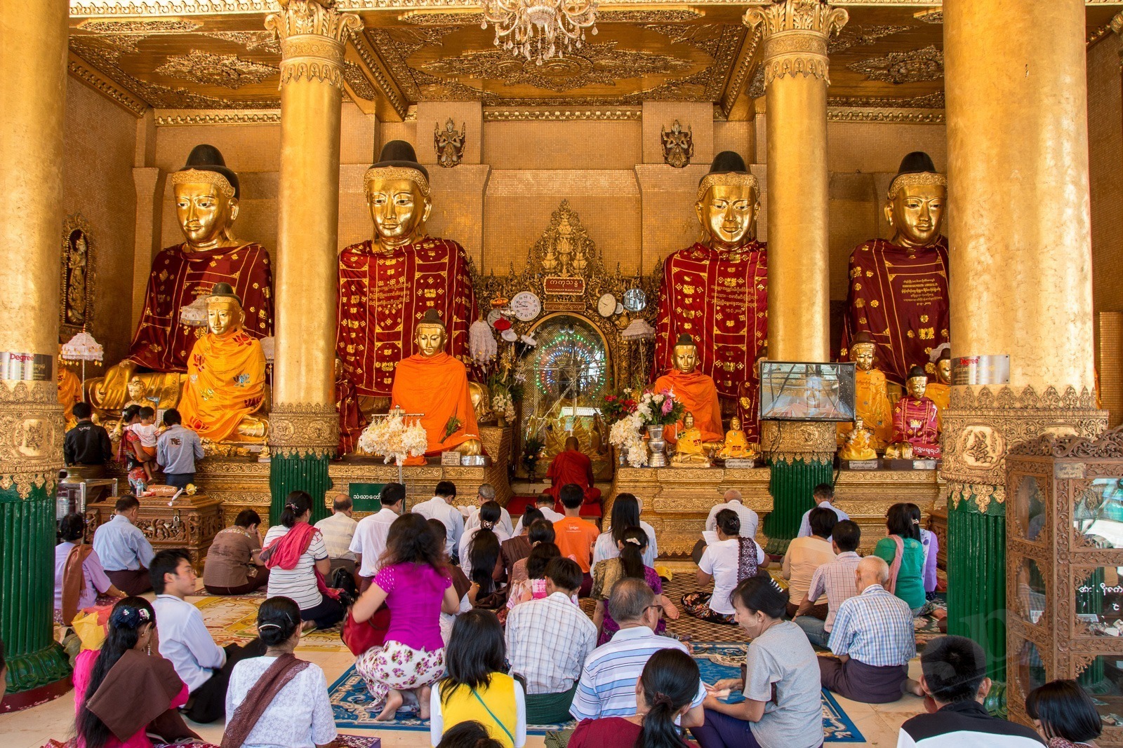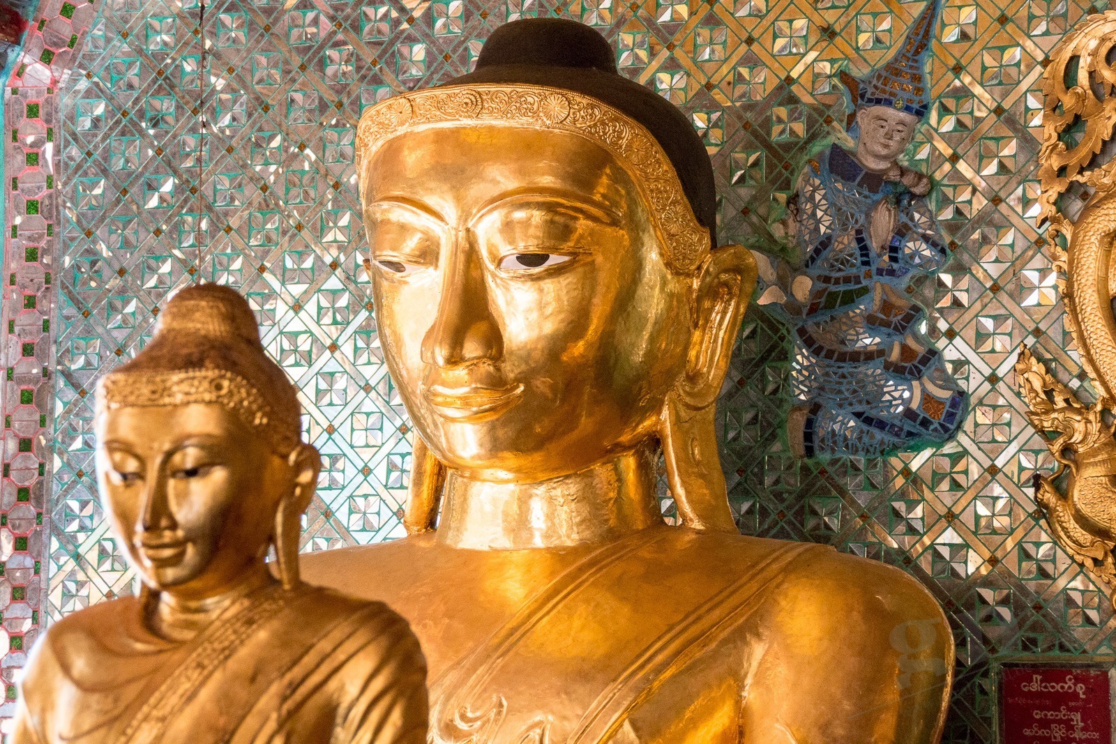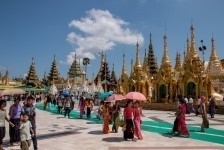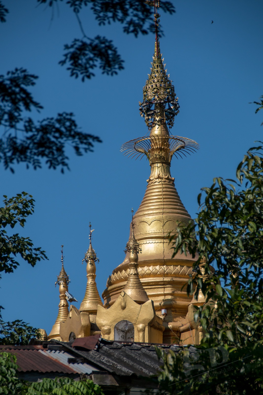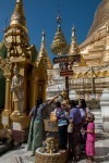 Wir steigen die lange Treppe zur Pagode hinauf. Und ab jetzt geht unser Mund nicht mehr zu. Wir kommen aus dem Staunen nicht mehr heraus. Gold und Buddhas. Und noch mehr Gold und noch mehr Buddhas. Wir werden von einer Frau angesprochen, ob sie uns durch die Pagode führen darf. Aber gerne doch! Unser Guide führt uns an unseren persönlichen Schreinen vorbei, denn jeder Wochentag hat hier eine eigene Ecke: Die Birthday-Corner. Wir sind beide an einem Freitag geboren und jeder Wochentag hat einen eigenen Schrein. Natürlich aus Gold. Die Kuppeln der riesigen Tempel sind aus Gold. Die Buddhas sind aus Gold. Wir sehen fast keine Touristen an diesem Ort. Wir werden sogar von Einheimischen fotografiert. Nach einigen Stunden voller goldener Buddhas und goldener Tempel wird der Fußboden immer wärmer und auf den teilweise schwarzen Fliesen verbrennt man sich die Füße.